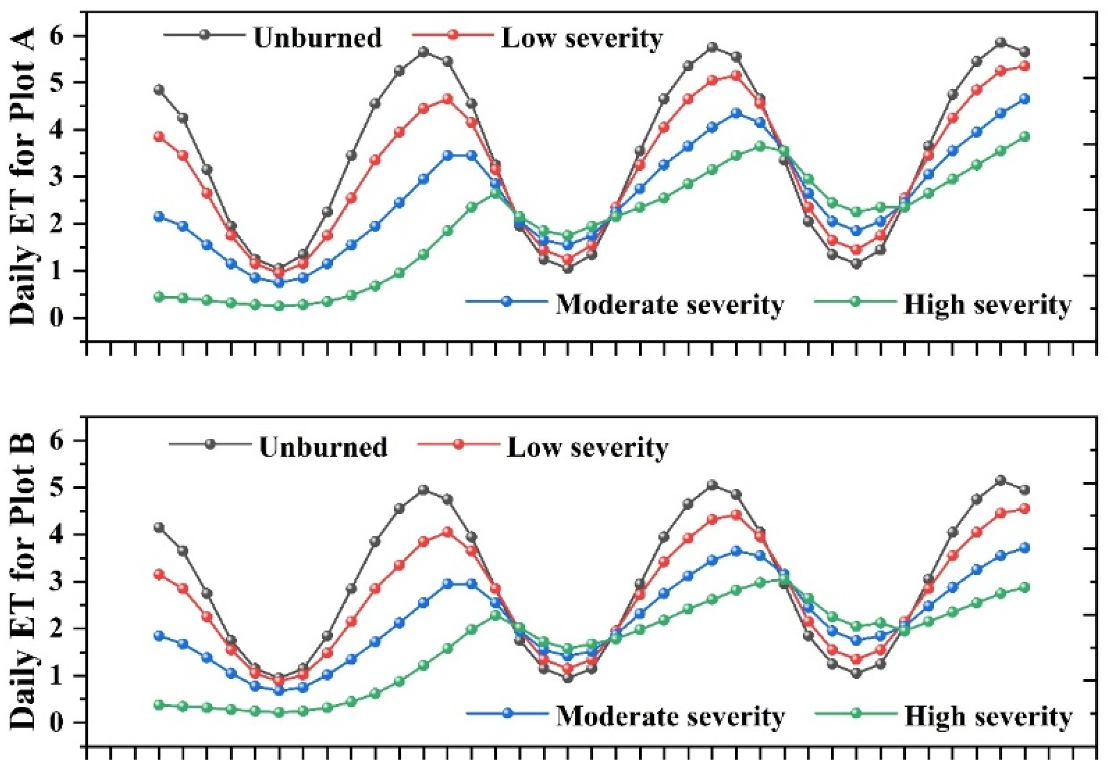 | Unburned | 5 days | 12 days | Short lag period | Healthy vegetation with an intact hydraulic system, rapid response |