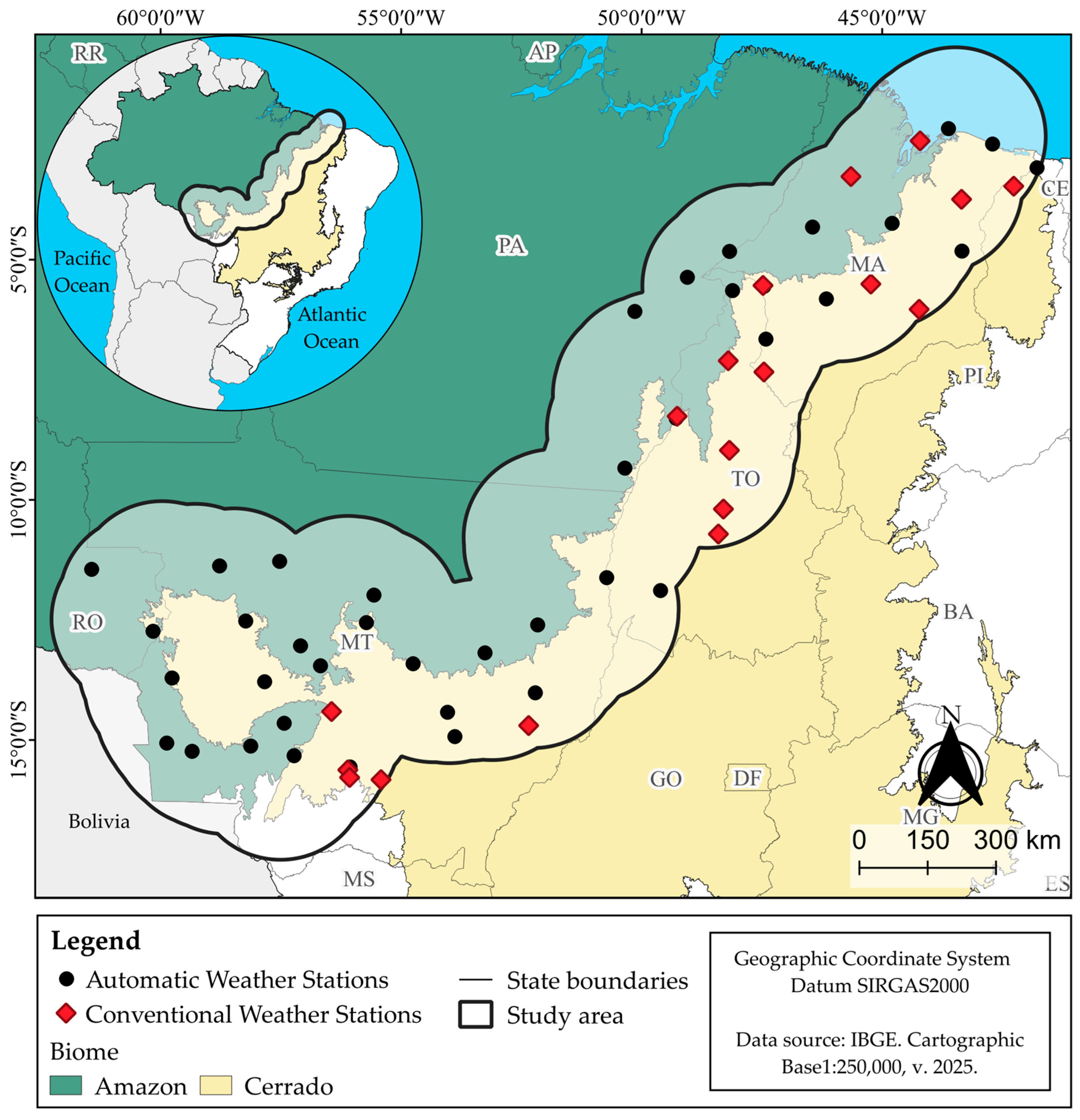 Table S1 (Supplementary Document) shows weather stations with the same name: in the Imperatriz (MA), Cuiabá (MT), and Conceição do Araguaia (PA), they are located at different points in each city (municipality), and, in these cases, some are even in different terrain and vegetation conditions, ensuring the spatial representativeness of the data. Thus, 67 stations, eight of which are installed at the same coordinates and operated jointly and simultaneously (conventionally and automatically)-these stations were not counted twice. INMET has been adopting a policy of transitioning from conventional to automatic data collection, with concurrent measurements for up to 7 years in the same location, with both types of stations; in the research, cases where this has occurred (automatic and conventional stations with the same coordinates), priority has been given to the use of data collected at automatic stations, supplemented with data from conventional stations to ensure continuous local measurements during the evaluated data period.