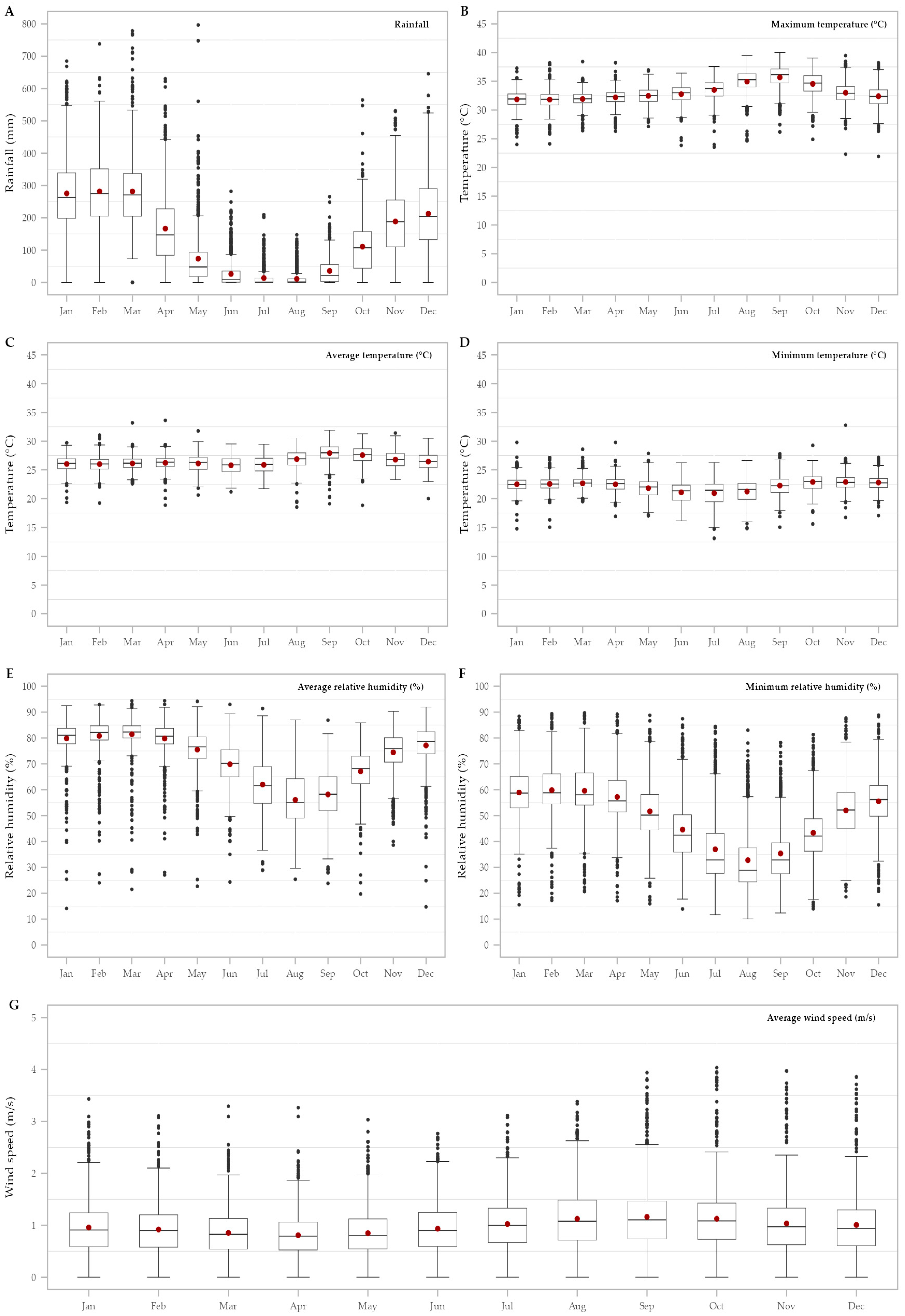 These results highlight the typical climatic seasonality of tropical regions, marked by a rainy season in the summer months and a well-defined dry season in the winter, directly impacting air humidity and thermal variability and, consequently, the risk of vegetation fires [