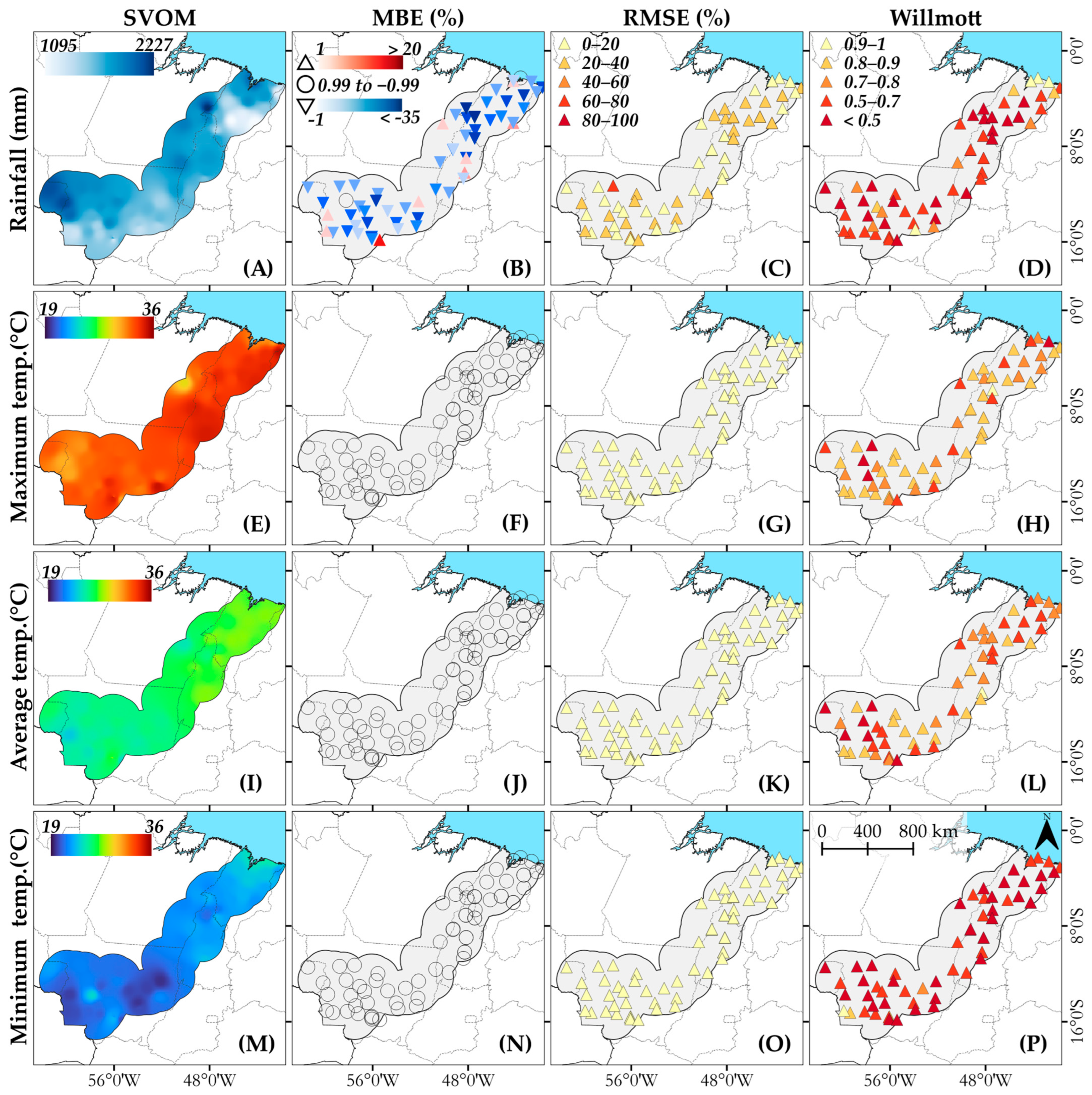 52]. In Brazil, researchers working on climate change frequently cite the need to avoid “forcing” reanalysis data against observations from stations that may present flaws. In regions such as the Amazon or the Midwest, the low density of stations and the percentages of failures discourage the use of more sophisticated correction methodologies [