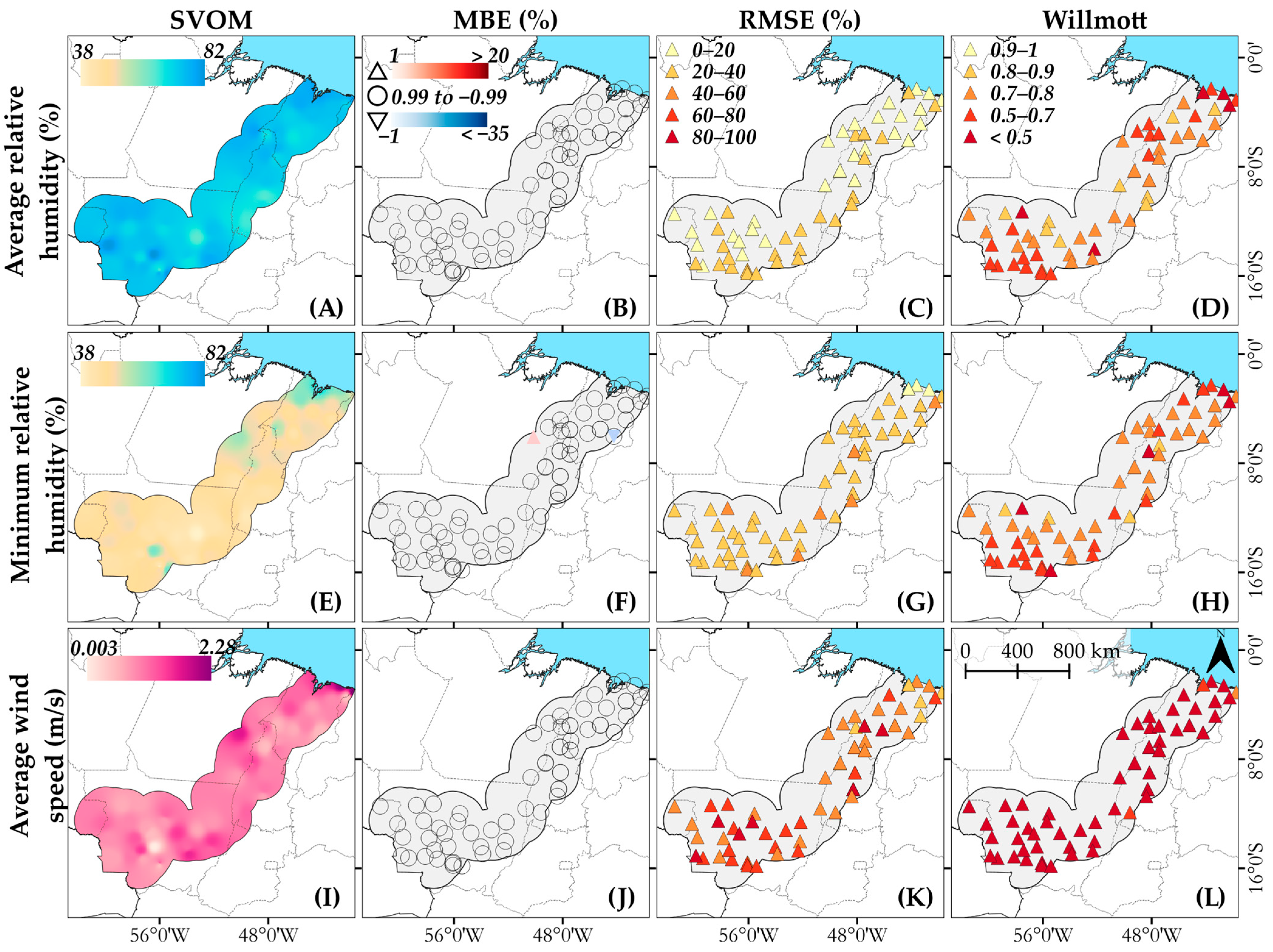 Regarding average relative humidity (RHmed), the states of Pará and Mato Grosso showed statistically significant differences, while minimum relative humidity (RHmin) showed a statistically significant difference only in Rondônia, indicating that the model, despite showing coherence in humidity estimates, is still limited for extreme values in some regions. Rainfall and relative air humidity stand out among the most used meteorological variables, while high temperatures and low relative humidity are key to the ignition of fires [