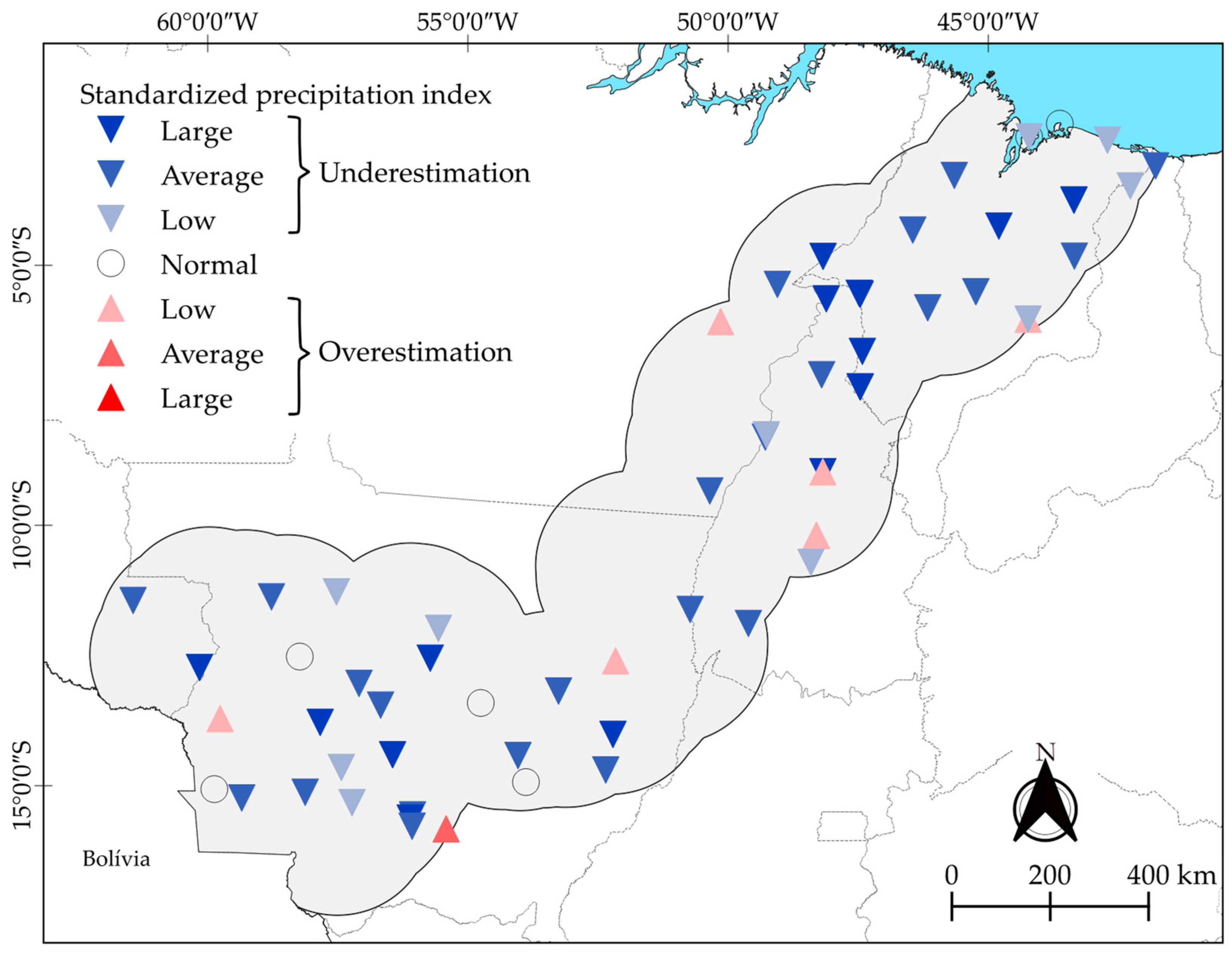 The application of the Normalized Precipitation Index (SPI) allowed for a rigorous validation of the ERA5-Land estimates, showing that, although the reanalysis captures regional seasonality, there are spatial discrepancies associated with terrain complexity and climate transition zones. The predominant tendency to underestimate precipitation, observed especially in the Cerrado-Amazon transition, corroborates studies that point to the limitations of grid models in representing mesoscale convective systems and the influence of moisture convergence in these forest edges [