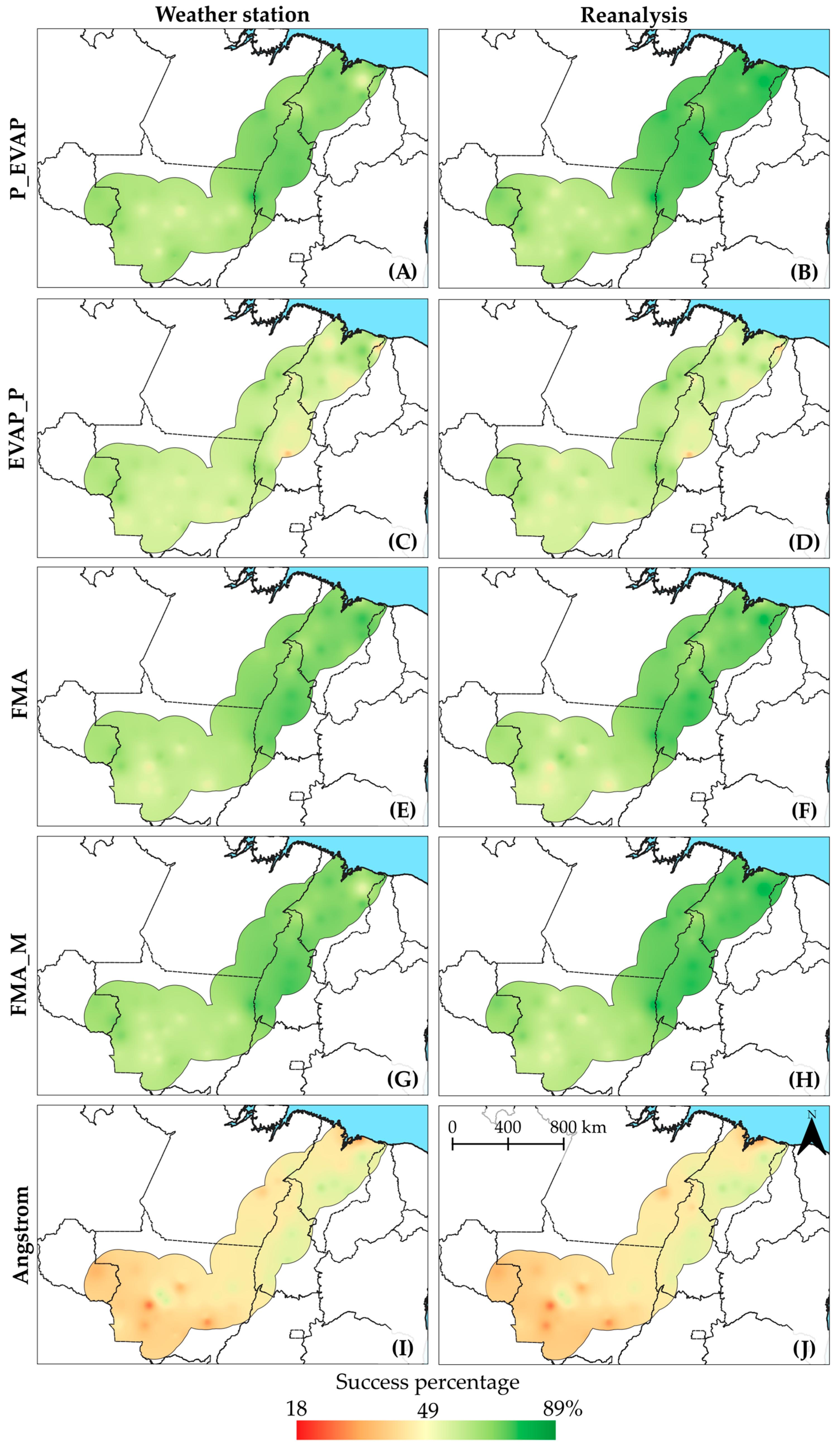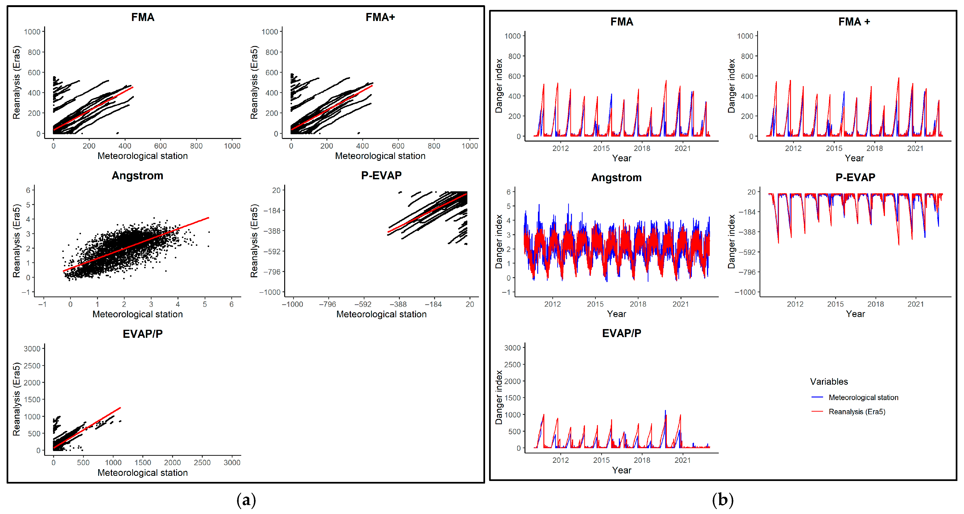 38], the index that presented the best performance was Ängstrom, followed by FMA and FMA+ in the Sinop-MT region, a transition area between the Amazon and Cerrado. While in our study area, the FMA index can be an intermediate alternative, and Ängstrom and EVAP/P show high variability, indicating lower reliability, and should be used with caution due to lower precision and lower reproducibility in the region.