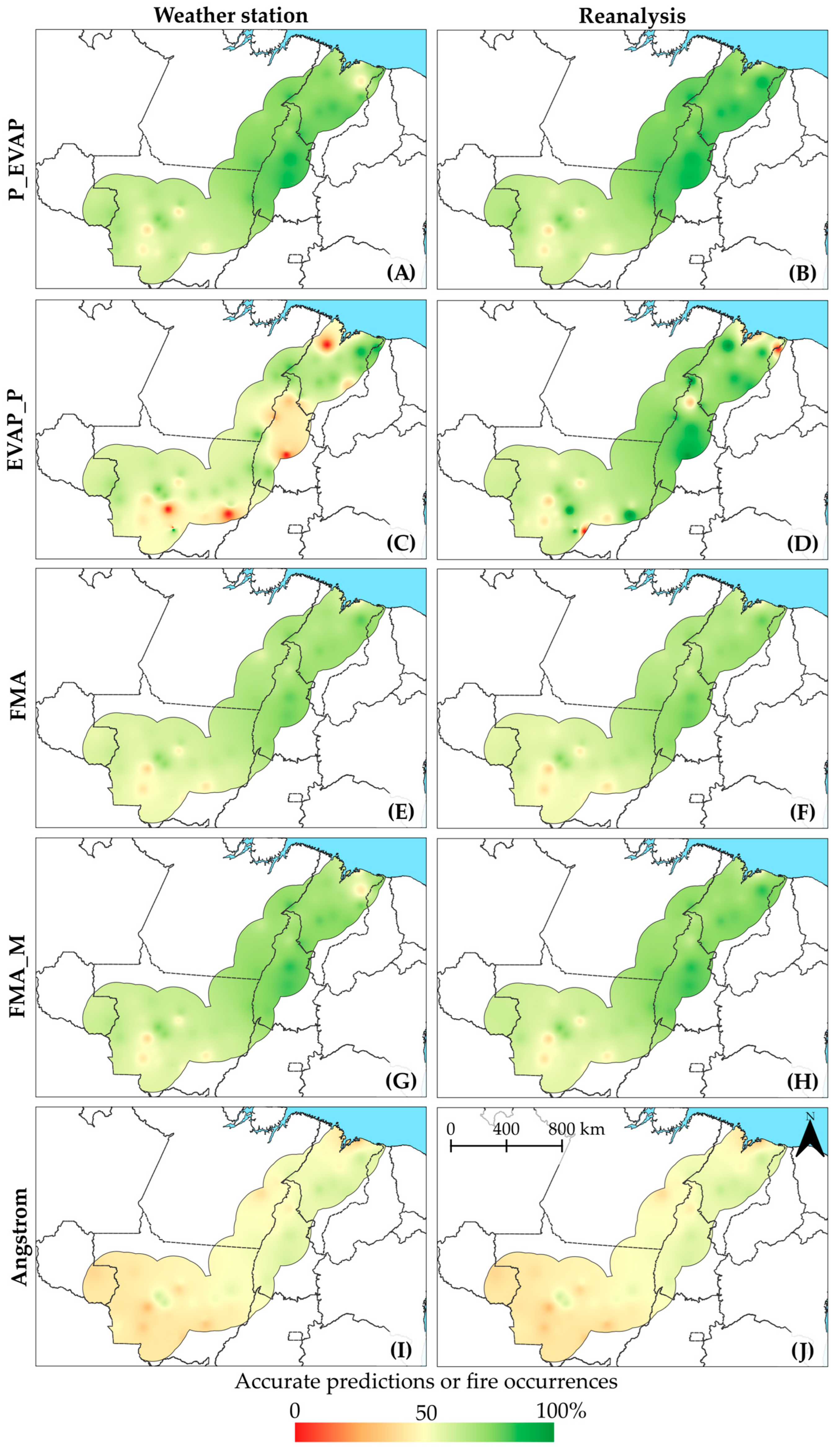65]. In the study area, when evaluating the performance of the indices, P-EVAP stood out as the best and most reliable predictive model for fire danger, followed by the FMA and FMA+ indices, considered to have the highest accuracy in predicting the occurrence of fires.