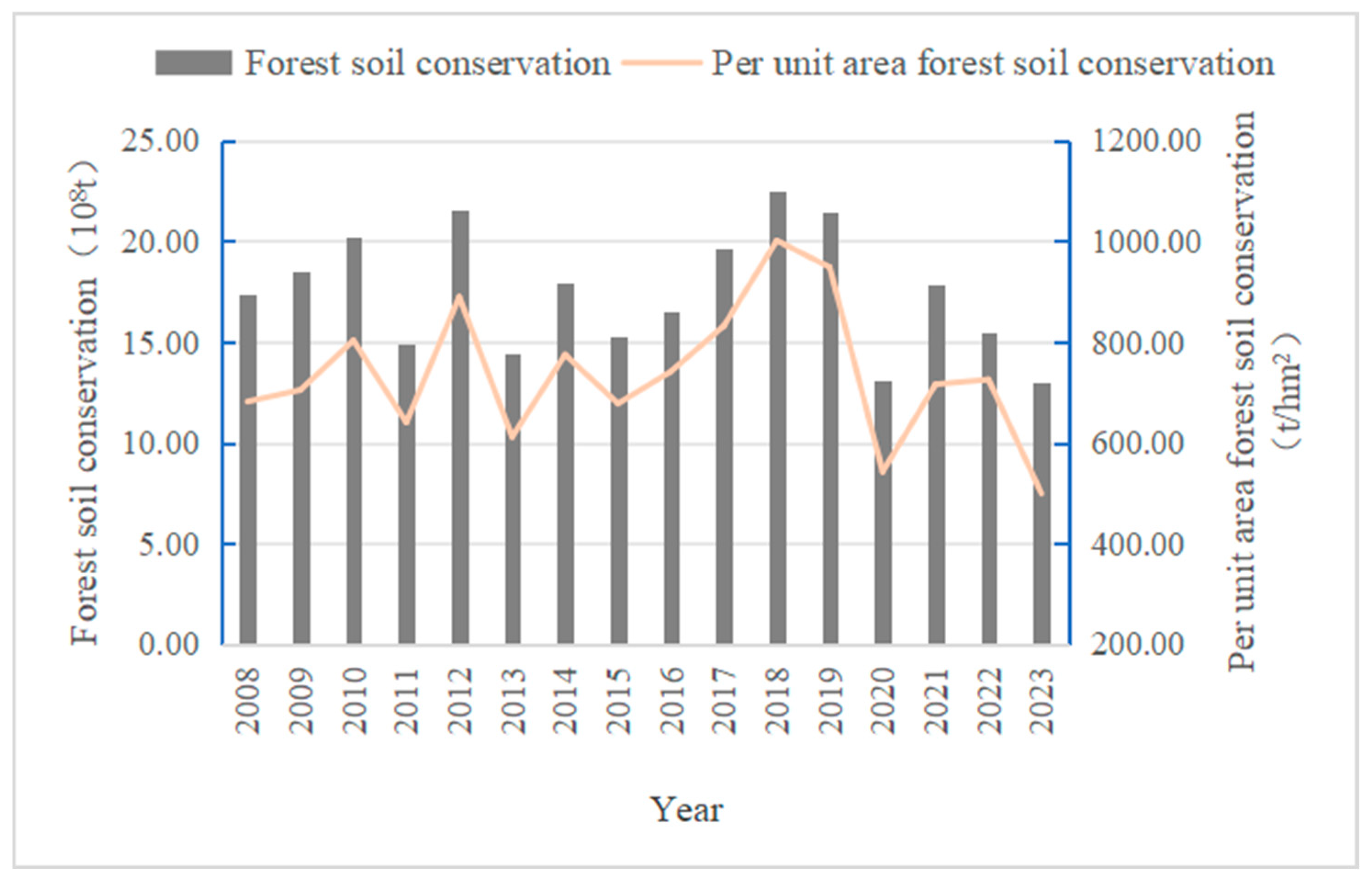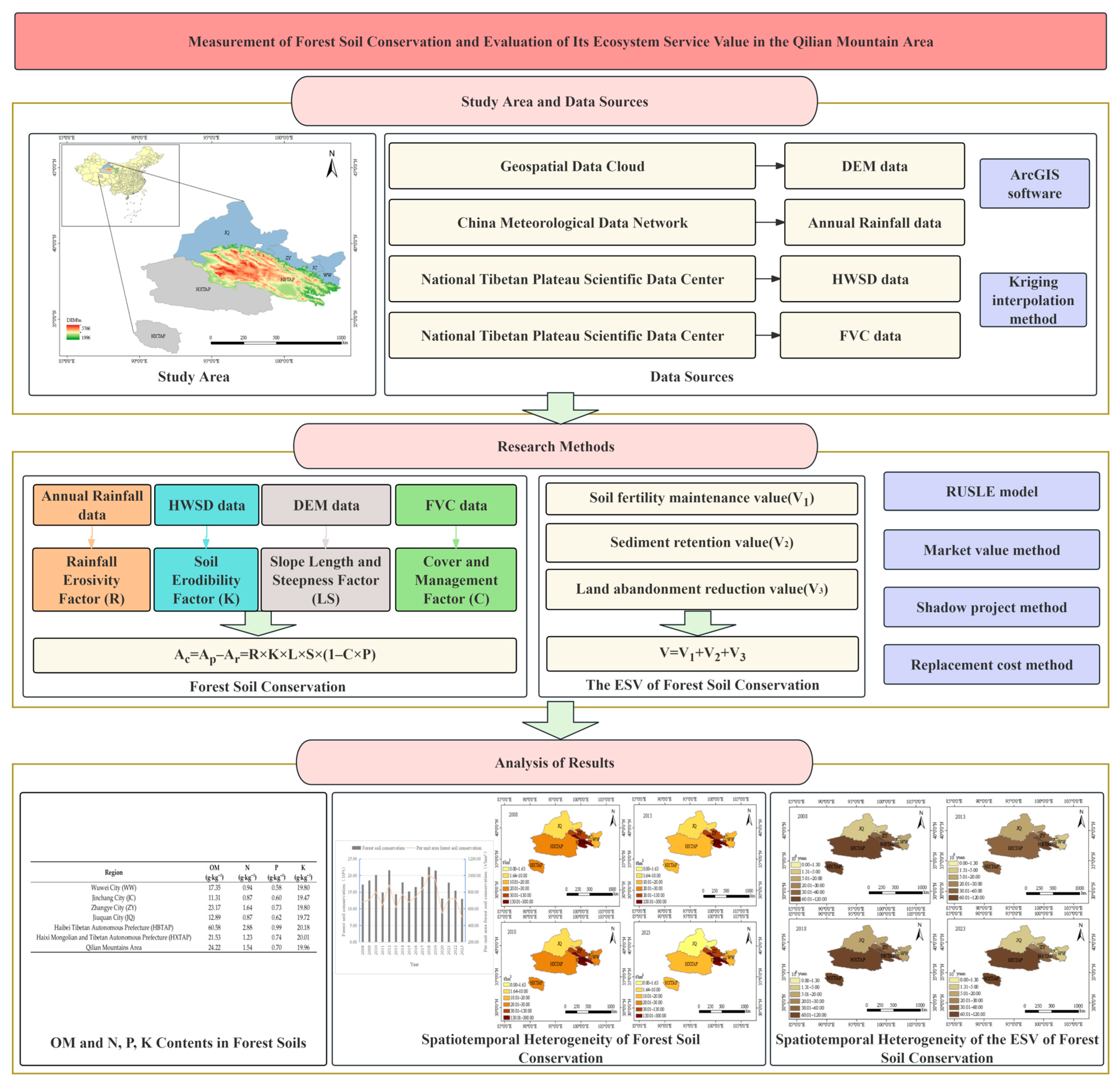 - The mean annual ESV of forest soil conservation during the same period was 204.44 × 108 yuan, also exhibiting a trend of initial increase followed by a decrease. HBTAP contributed the highest average annual ESV, with HXTAP, ZY, WW, JQ, and JC trailing in descending order.