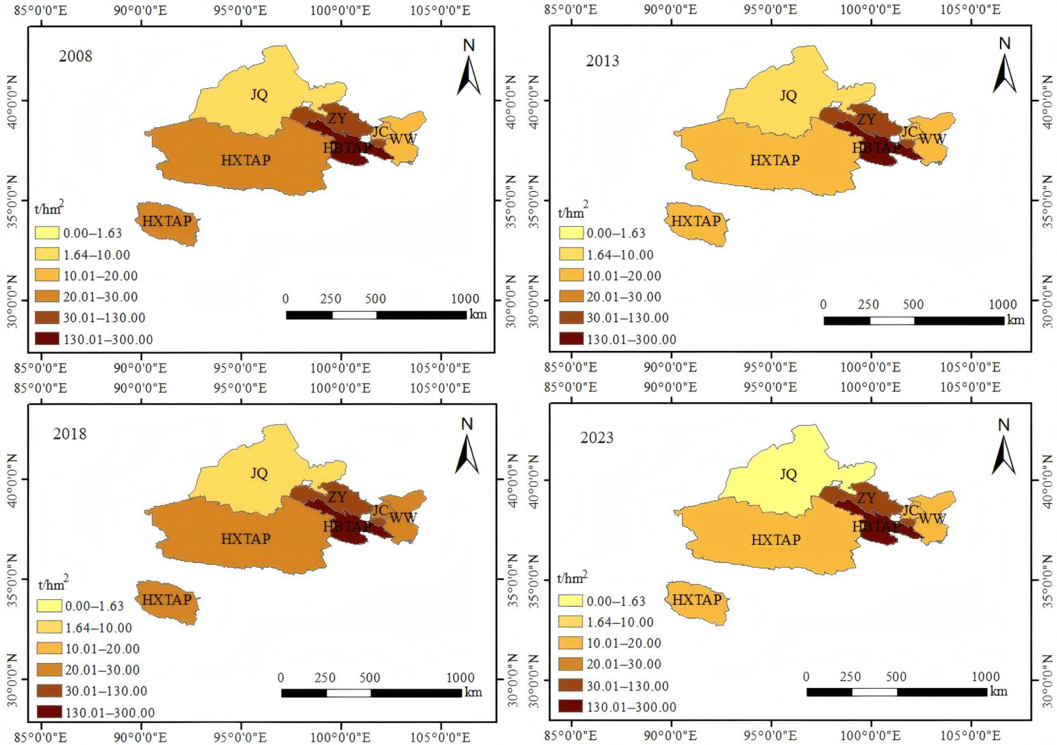 | Year | WW (t·ha−1) | JC (t·ha−1) | ZY (t·ha−1) | JQ (t·ha−1) | HBTAP (t·ha−1) | HXTAP (t·ha−1) | Qilian Mountains Area (t·ha−1) |