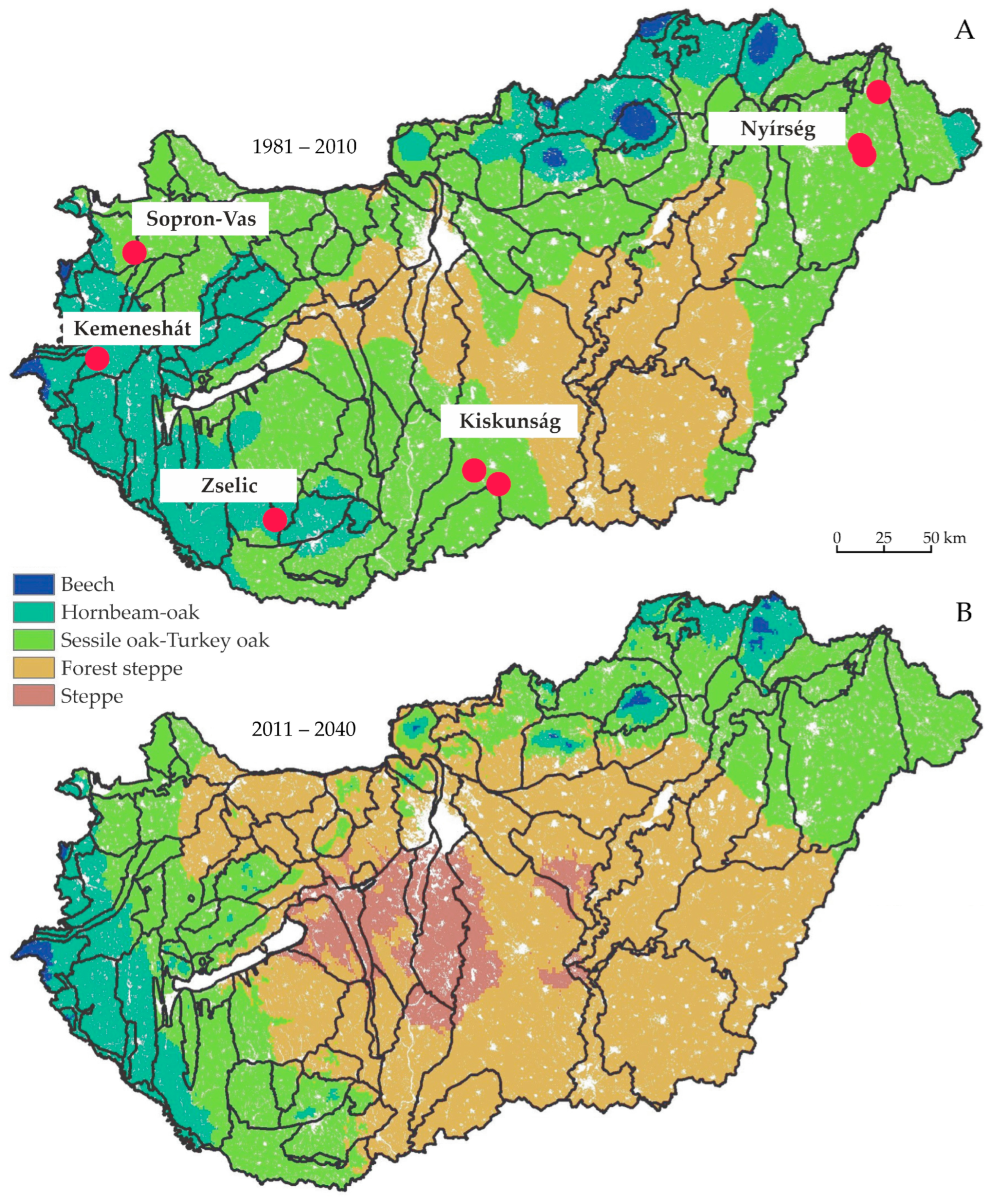 Figure 1B presents projected future climate zones according to a current scenario model. These projections indicate that a substantial supply of raw material for the timber industry can be anticipated in the coming decades, as black locust is likely to assume an increasingly dominant role under changing climatic conditions. Compared with other principal species such as oak and beech, black locust is characterized by shorter rotation periods, which may further enhance its silvicultural and industrial relevance. Within the forest steppe climatic zone, plantation forestry predominates, and black locust establishment is particularly intensive. Owing to afforestation efforts, forest cover within this zone has already exceeded 40%, and this proportion is expected to increase further as climate change progresses. As a consequence of these afforestation activities, stands managed on relatively short rotation cycles have become prevalent. Nevertheless, assessments of the current importance and future role of black locust remain highly polarized. It is important to emphasize the territorial expansion of black locust, which presently occupies approximately one-third of the forest-steppe climatic region. The species also has a notable presence in the sessile oak–Turkey oak climatic zone and occurs on smaller, yet ecologically relevant, areas within hornbeam–oak forests [