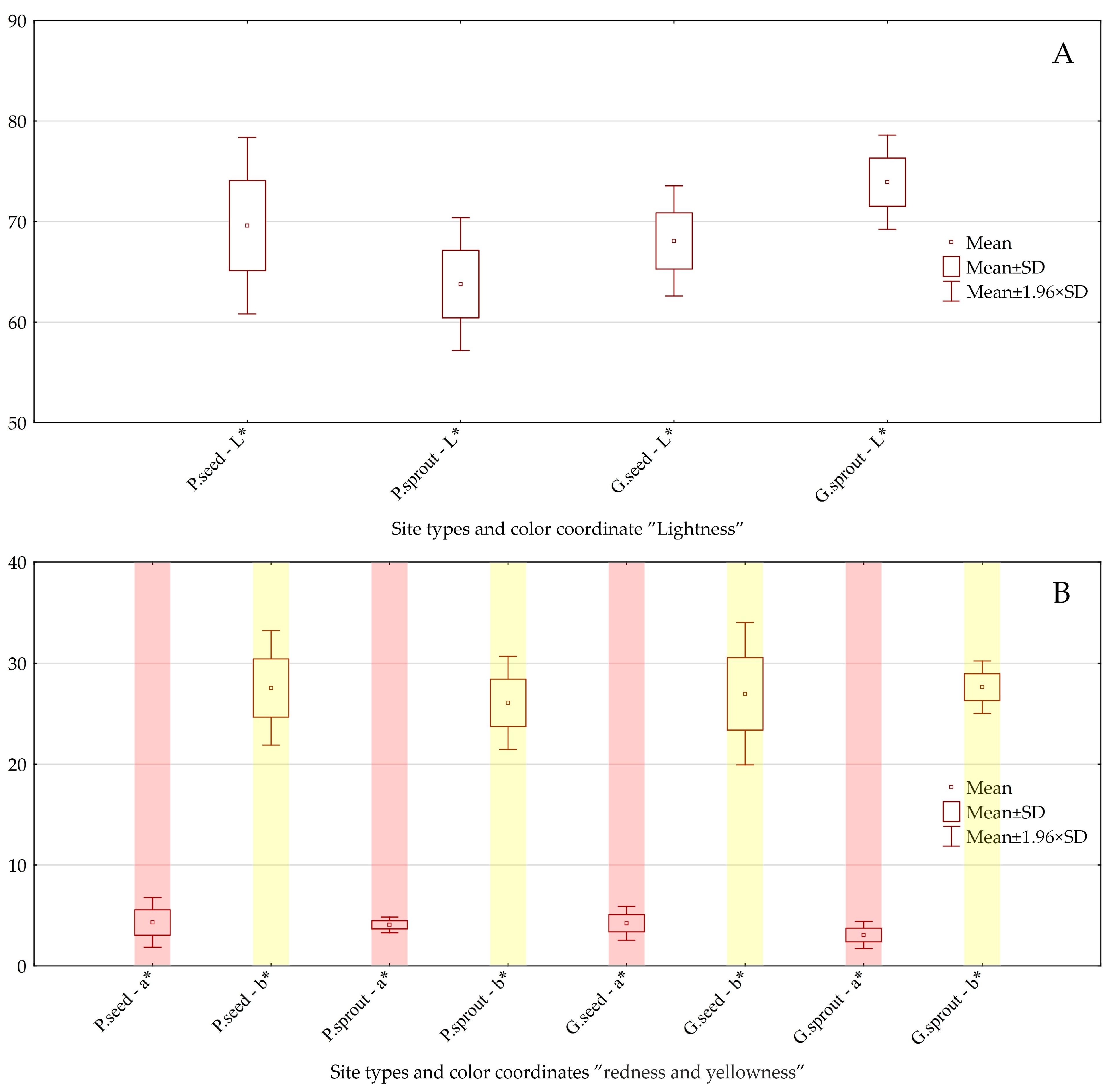 Section 3.5. In contrast, ANOVA analysis indicated that, at the 0.05 probability level, the similarity between PSe and GSp for b* reached 0.75. The b* parameter represents the yellow chromatic component, which remained comparatively high despite differences in site quality (poor versus good) and cultivation mode (seedling versus sprout) that may influence extractive composition. Verification of this phenomenon would require detailed chemical or durability analyses, which fall beyond the scope of the present study. Németh et al. [