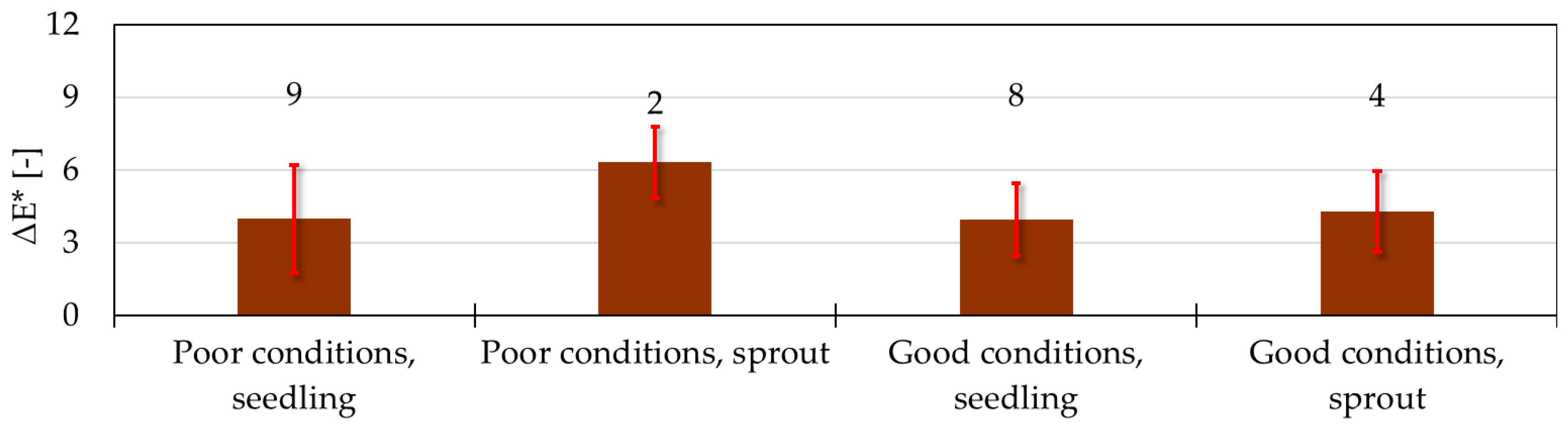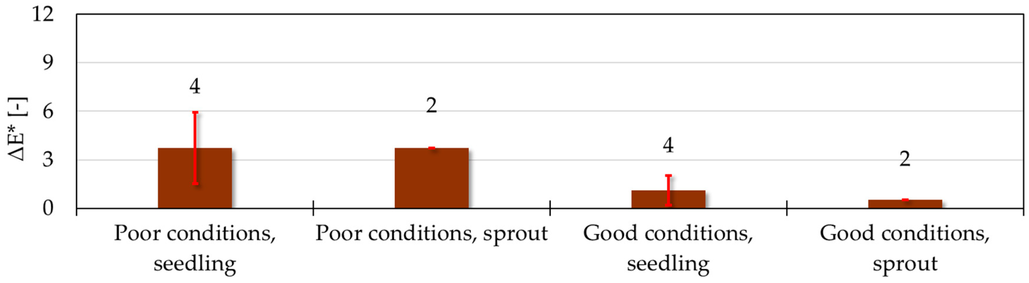 63] claimed that site conditions influence the visual appearance of Turkey oak wood through its extractives. The same is expected for black locust. An important result is that sprout-origin samples showed lower standard deviation values than seed-origin samples for all color coordinates. No additional statistically demonstrable relationships were identified among the four site types with respect to the individual color components. Overall, at the level of the whole sample set, substantial variation in color parameters exists among black locust trees grown under differing site types. The total color difference (ΔE*) is analyzed in the following section.