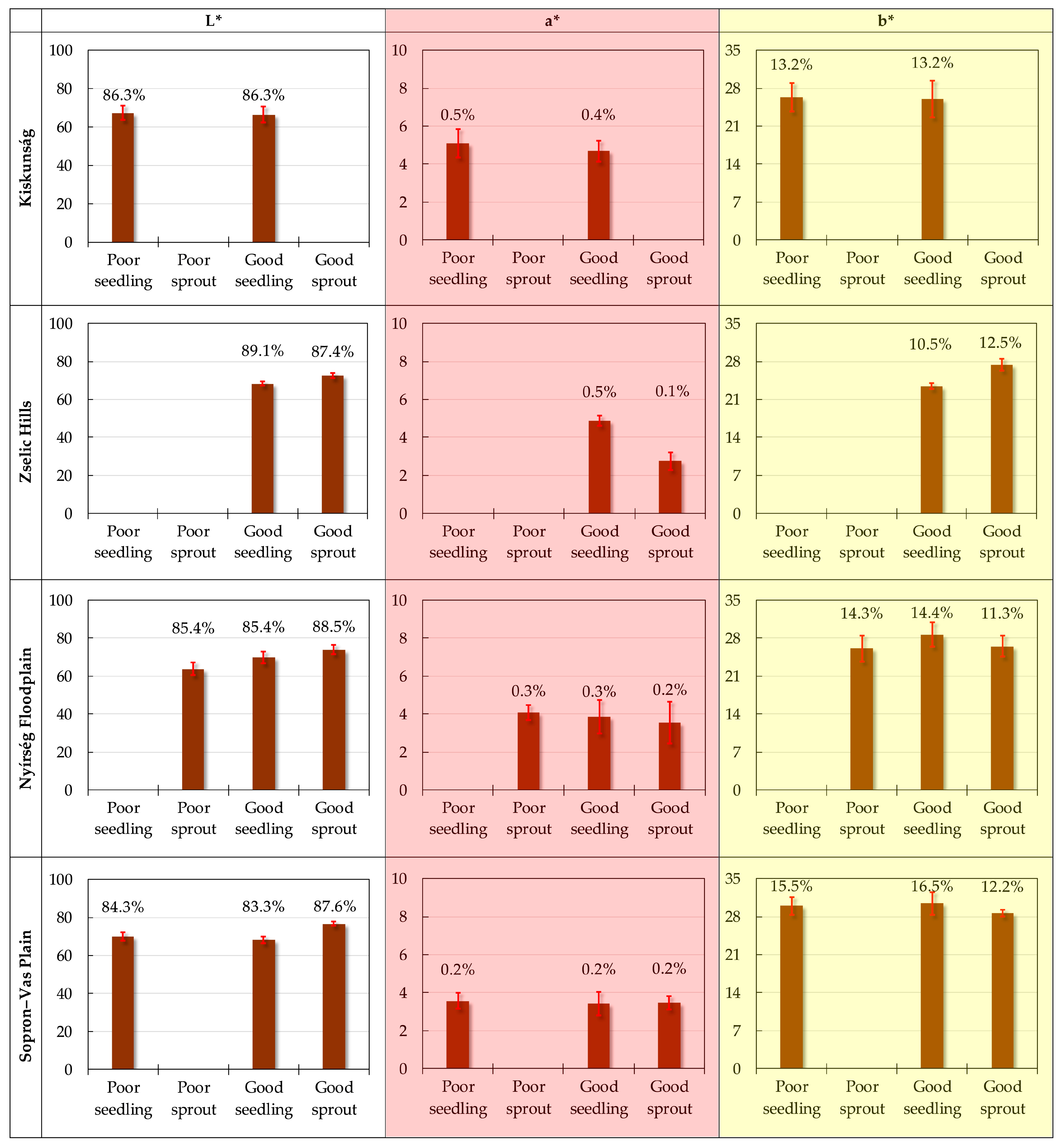 Table 3. Overall, statistically significant similarities for individual color coordinates were infrequent within regions, and even among them, several had only a weak correspondence. In other words, regarding chromatic attributes, seed-origin trees differed from other seed-origin trees, sprout-origin trees differed from other sprout-origin trees, and seed-origin and sprout-origin trees likewise differed from one another when site types were compared within the same region. The lowest level of similarity was observed for lightness, whereas the highest similarity—averaging 21.4%—was detected for the yellow (b*) component.