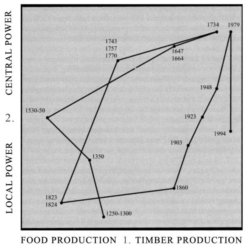 One of the most apparent land use conflicts through the centuries in Sweden has been the one between agricultural and forest interests. Figure 1 gives a rough overview of the changes in Swedish policy concerning the use of Swedish forests for production of either food or wood between the 13th century and 1994.