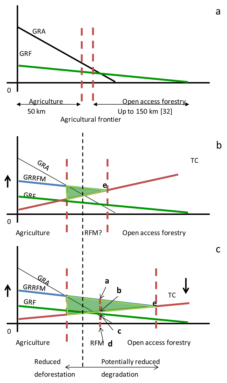 Figure 1b shows how this situation may change if the gross rent of forest management can be increased (GRRFM), for example, by a substantial additional price for products from well-managed forests, or by reduced costs of forest use through increased efficiency and increased social acceptability of the forest operations. Although products from well-managed forests often have to compete on national markets with those of open access forestry and received no additional price for coming from well-managed forests, in some cases costs were reduced while in others monetary benefits were obtained from governmental incentive schemes. The latter was the case, for example, in Costa Rica between 1998 and 2002, although as the transaction costs of the Costa Rican PES scheme were too high for some participants, the option was financially less attractive for them in the short run [17]. Subsidized certification of forest management units had similar results in the Peruvian Amazon [34]. Where differentiation of products, monetary incentives or cost reductions are obtained, the increased gross rent of RFM results in reduced agricultural area (through avoided deforestation, tree planting or restoration of degraded forests), but has little effect on open access forest use.