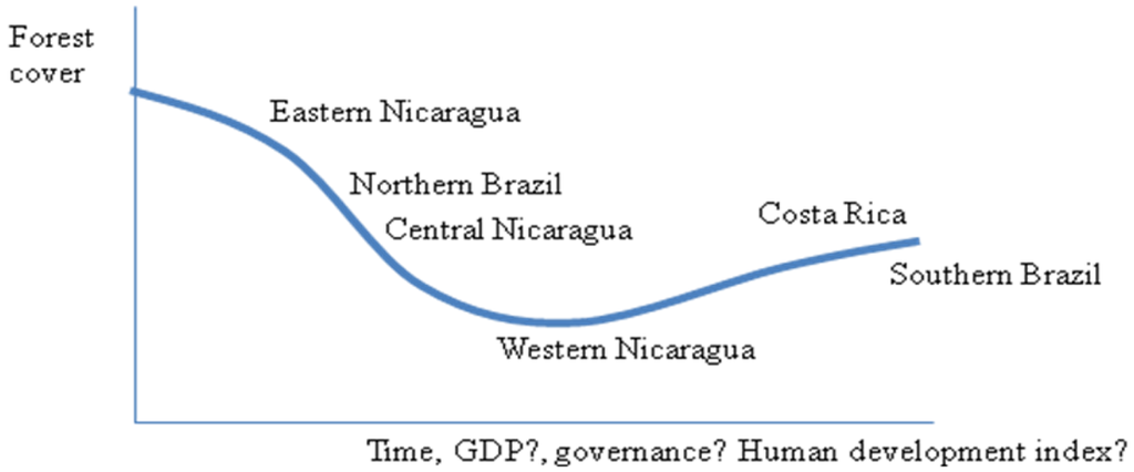 Markets and policies may influence land rent. In addition, the position of a country or region along the forest transition curve (Figure 2) may influence the direction of policies and prices and, therefore, whether land rents rise or fall [3], affecting height and slope of the gross rent curves in Figure 1. The level of development may also influence the height and slope of the TC curve in Figure 1. At the left end of the forest transition curve, access to extensive forest areas prompts forest use and later conversion and private ownership at relatively low costs—a situation that, in Central America, can still be seen in the broad-leafed forests of the eastern coasts of Honduras and Nicaragua, for example. Moving along the curve to the right, access improves; population density increases and government services start to appear. Agricultural land rents rise, forest cover diminishes: the central part of Nicaragua offers a good example of this. Further to the right (and to the west in Nicaragua), land rents start to stabilize, access improves as does local governance (e.g., clearer land rights), reducing the transaction costs to implement forest management, and an agricultural landscape mosaic with forest patches emerges. Such is the case along the Pacific coast of Nicaragua, where this mosaic is enriched by plantations, although very few areas of the original dry tropical forests remain. This may well be an additional reason for recovery: forests become scarce and therefore their value rises [3,27]. A similar gradient can be seen from northern Brazil (Amazon) to the South of Brazil, although further research is needed to confirm in-country application of the forest transition curve. Looking at the northern zone of Costa Rica, for example, we can see that the forest cover is highly dynamic, with priorities moving between plantations, secondary forests and agricultural crops, depending on market and policy pressures, while also strongly influenced by ecological processes. This resembles the cyclic movement within the transition curve discussed by Uriarte et al. [38].