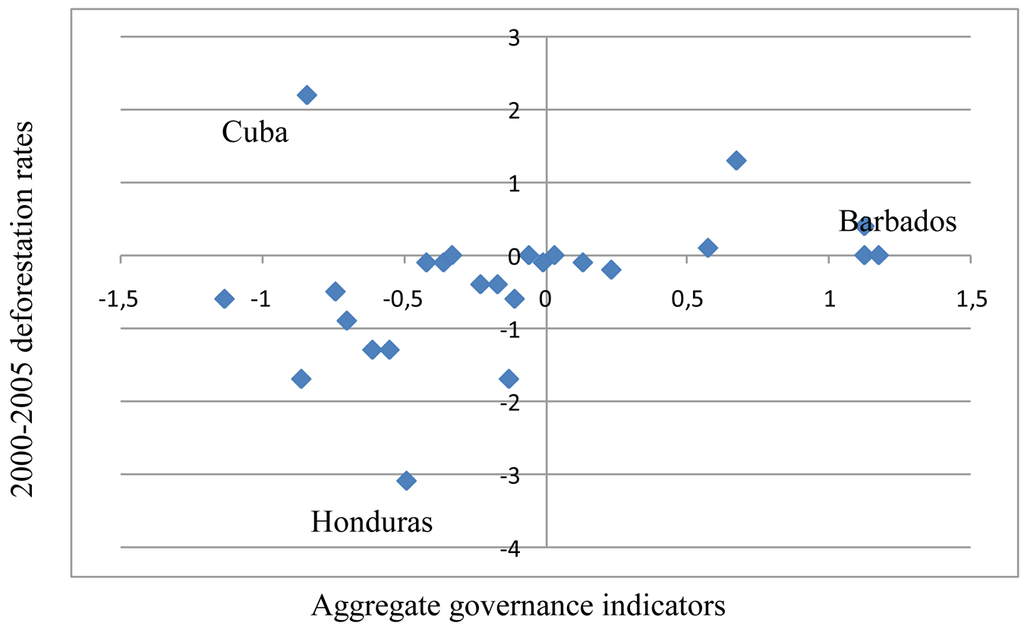 REDD+ mechanisms, therefore, will need to take into account the specific characteristics of the areas and populations where they will be implemented. The position of a country or region along the forest transition curve may be an indication of such local conditions. In analyzing this position and its implications for REDD+ it is important to consider the independent variables used to reflect the ‘development phase’ along the x-axis: time [3,42], gross domestic product per capita [43-45], availability of technical know-how [40], or perhaps something similar to the human development index, which incorporates many (although not all) of the factors that may influence people's willingness to address conservation issues. Several studies [46,47] have studied how governance may influence deforestation rates, coming to a variety of different conclusions. We plotted the Kaufmann–Kraay–Mastruzzi aggregate governance indicators (Figure 3) [48] with rates of deforestation in Latin America [49], suggesting a positive relation, although it is not linear and not consistent across all countries (Figure 3). The lack of consistency of the results of governance–deforestation studies may be due to the indicators used or to changes in their relative importance while a country is progressing along the transition curve. Lopez y Galinato [46] for example used different indicators than Bond et al. [47] or Kaufman et al. [48] and found a negative effect of governance improvement on deforestation in Brazil.