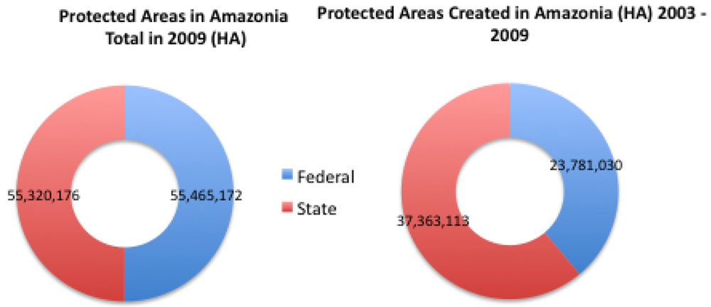 Considering that 74% of the global area put under protection since 2003 is in Brazil [19], it is clear that state-level policies in Brazil have been crucial for the protection of biodiversity and thus form an important variable for any mechanism designed to reduce carbon emissions by protecting tropical forests.