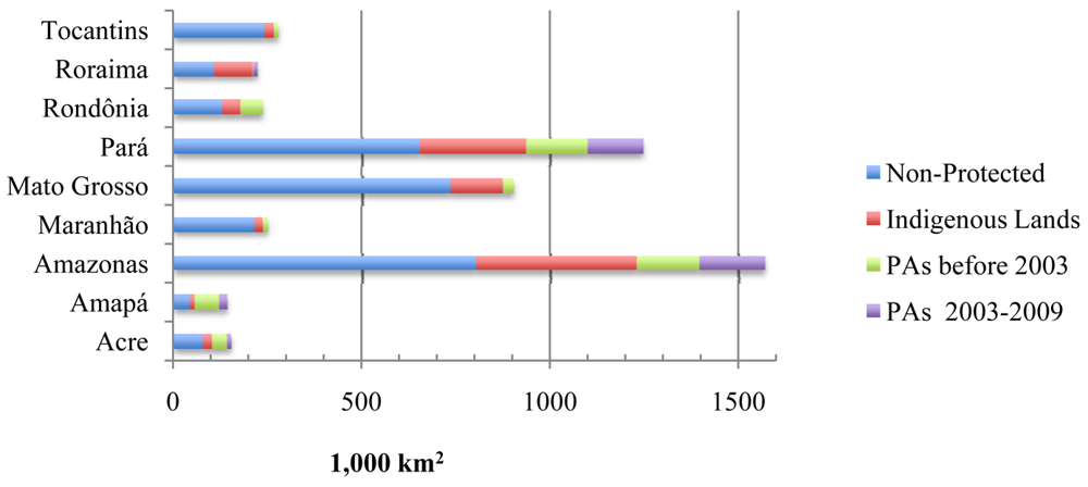 - Data shown on Figures 1–3 and on Table 2 draw on data obtained from Instituto Socioambiental, and refer to area of PAs as of 2009 Data discount overlaps between PAs. Available online: http://www.socioambiental.org/loja/detalhe_produto.html?id_prd=10333 (accessed on 1 August 2010)