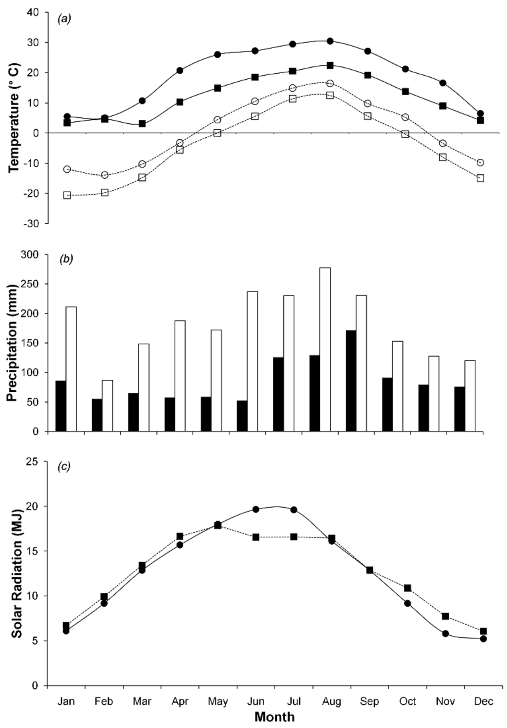 We collected data at two study sites, Hitsujigaoka and Takayama. Hitsujigaoka is located in northern Japan at 42°59′13″ N and 141°23′7″ E and is 180 m above sea level. Takayama is in central Japan at 36°8′46″ N and 137°25′23″ E and is 1,420 m above sea level. At each site, a flux tower collected meteorological data and ecological characteristics. Averaged over five years, from 2001 to 2006 (Figure 1), the maximum temperatures at Hitsugaoka and Takayama were 24.9 ± 1.8 °C and 22.4 ± 1.6 °C in August, while the minimum temperatures were −12.4 ± 1.7 °C and −11.7 ± 2.1 °C in February, respectively. The mean annual precipitation and mean annual solar radiation at Hitsujigaoka were 1,047 ± 174 mm and 12.25 ± 0.4 MJ m−2 day−1, respectively, whereas at Takayama they were 2,275 ± 165 mm and 12.43 ± 0.3 MJ m−2 day−1, respectively. Both sites experience snow cover in the winter (December to April) to a depth of 1 m.