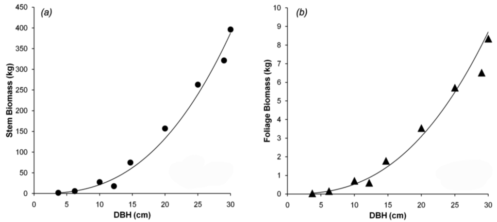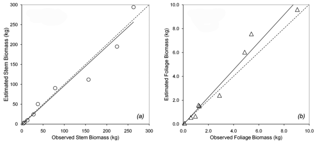 Because the study site was a mature forest we do not present an age-series analysis. In this study, we were interested in biomass production because biomass directly relates to the amount of carbon stored by the tree canopy. Our results were validated with the observed data, and a linear regression was applied to investigate accuracy.