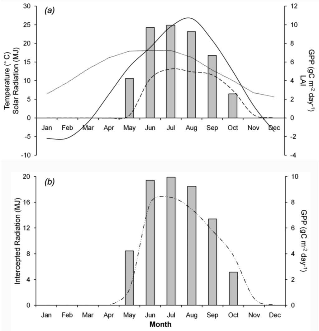 GPP was influenced by LAI and solar radiation, as well as environmental conditions, especially temperature. Figure 4a plots observed GPP with average temperature, solar radiation, and LAI throughout the year. GPP occurred from May to October and was highest in July. Conversely, there was no GPP from November to April. GPP responded to leaf phenology, with leaves emerging in May and falling in November. Solar radiation and LAI peaked in July, resulting in high levels of intercepted solar radiation (Figure 4b) and maximum GPP. The temperature modifier affected quantum efficiency. Figure 5 shows the relationship between mean annual temperature and the temperature modifier to determine Tn, Topt, and Tx for growth. Thus, in this study, Tn, Topt, and Tx were 8.5 °C, 24.5 °C, and 36 °C, respectively. If the mean temperature was less than Tn or greater than Tx, αC was 0 and caused GPP to also be 0.