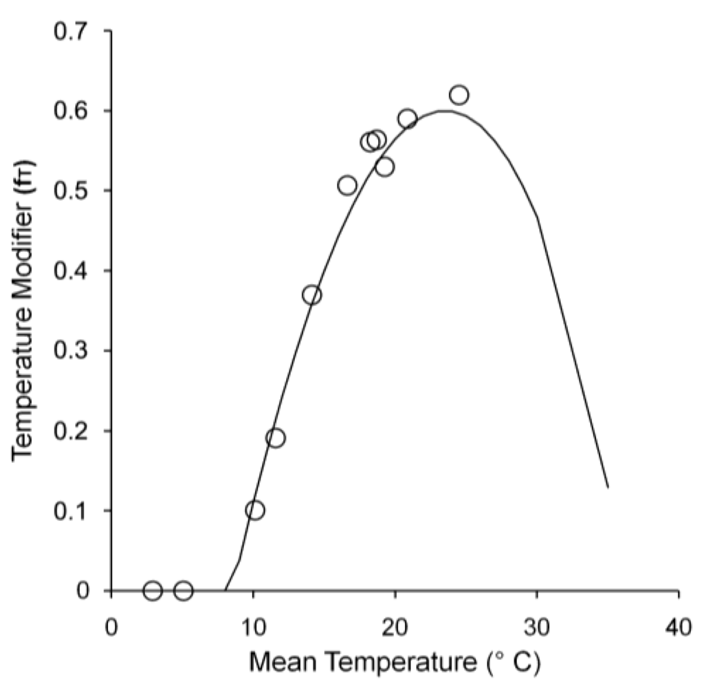 The main input parameters required are site factors and species-specific data of the species of interest (Table 1). The site factors include latitude, maximum available soil water (ASWx: mm), soil texture (sandy, sandy loam, clay, or clay loam), and fertility rating (FR). Species-specific parameter values are adjusted for each species. If the parameter values for a species do not exist, parameterization of the new site-specific parameter is necessary. Another input is meteorological variables, including mean air temperature (Ta: °C), mean solar radiation (SR: MJ m−2 day−1), total precipitation (R: mm), frost days (dF: days per month), and vapor pressure deficit (VPD: mbar). If VPD is not available, it can be calculated from the maximum and minimum temperatures (Tx and Tn: °C) as half the difference between the saturated vapor pressure at Tx and Tn. The meteorological inputs can be actual monthly data or long-term monthly averages.