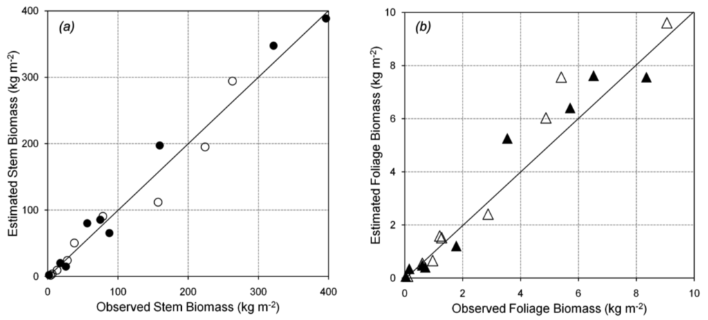 Tree canopy properties were measured in a 100 m × 100 m permanent plot near the flux tower at Takayama []. Within the plot, 24 trees (comprising several species) were selected to measure DBH, height, and tree density. Trees with DBH from 1.7 to 29.0 cm were selected to represent the different stand ages, because the actual stand age was not identified. Nine of the 24 sampled trees were B. platyphylla, with a range of small to large DBH. The different DBHs can be used to predict forest growth. The trees were harvested for biomass calculation using the dry mass of the stem and the foliage. Data for B. platyphylla were used for parameterization in biomass partitioning. Figure 2a shows the allometric relationship between DBH and stem biomass. Figure 2b shows the allometric relationship between DBH and foliage biomass. The allometric parameters gave an excellent fit to the trend lines, with r2 = 0.97 and 0.98 for stem and foliage biomass, respectively. The equations in Figure 2 were used to re-estimate stem and foliage biomass at Hitsujigaoka for validation. The results are shown in Figure 3, where the plots of estimated versus observed stem and foliage biomass were close to one-to-one linear relationships. Stem biomass was underestimated by around 3%, whereas foliage biomass was overestimated by about 15%.