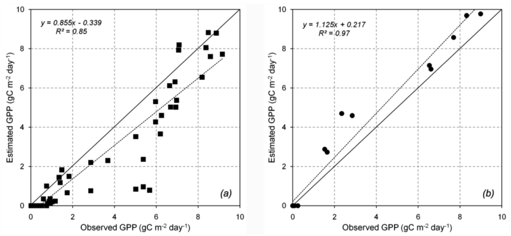 The GPP estimation at Hitsujigaoka and Takayama is presented in Figure 7a and 7b, respectively. The monthly estimated GPP was compared with the observed GPP from 2000 to 2004. The results for both locations showed a good correlation in terms of the linear regression, with r2 = 0.85 and 0.97 at Takayama and Hitsujigoaka, respectively. The 3-PG model indicated that inter-annual GPP peaked around July and August and was 0 in winter (November to April). GPP was lower at Takayama than at Hitsujigaoka because of the smaller LAI at Takayama. Thus, the interception of radiation was lower at Takayama. The GPP at Takayama was underestimated because of the mixed age of the trees in the plot and the influence of the temperature modifier. The low value of the latter at the beginning of the growing season resulted in the low estimate for GPP (low points in the graph). At Hitsujigaoka, the GPP was overestimated because the large tree leaves could absorb more solar radiation for photosynthesis. The average GPP over 5 years was 973.30 g C m−2 (Takayama) and 1255.21 g C m−2 (Hitsujigaoka). Table 4 compares the estimated and observed values of GPP in terms of root mean square error.