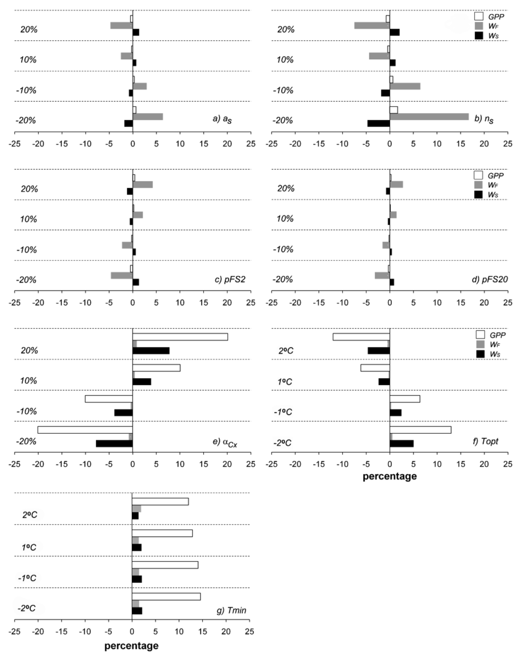 Changing selected parameter values from −20 to 20% had different effects on the estimated output. Figure 8 shows the effects of changes in as, ns, pFS2, pFS20, αCx, Tn, Topt, WF, and Ws. Changes in as (Figure 8a) and ns (Figure 8b) primarily affected WF; when as and ns were changed by −20%, WF differed by around 16% and 6%, respectively. However, the selected outputs were less sensitive to changes in pFS20 (Figure 8d) than pFS2 (Figure 8c). GPP was highly sensitive to αCx (Figure 8e) and to Topt (Figure 8f). Ws was also sensitive to both of those parameters, but not as sensitive as GPP. Tn (Figure 8g) most affected GPP when it was changed by 20 °C. From these results, we recommend that αCx, Topt, and Tn be carefully measured if accurate results are desired, especially in GPP calculations.