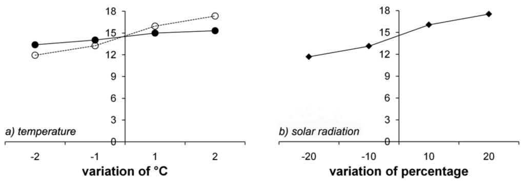 A sensitivity analysis was carried out to examine how parameter values influenced the output. The parameters examined were as and ns, biomass partitioning ratio at B = 2 and 20 cm, maximum canopy quantum efficiency (αCx), Tn, and Topt. These are the main parameters of biomass partitioning and biomass production, and the most influential for GPP estimation. We determined the effects of changes in these parameters on Ws, Wf, and GPP. Additionally, sensitivity to meteorological data was analyzed with the GPP results. The parameter values changed by −20%, −10%, +10%, and +20% from the default values, except for temperature, which was changed to degrees Celsius (−2 °C, −1 °C, +1 °C, and +2 °C) since changes in degrees Celsius usually showed a more significant effect than those in percentage.