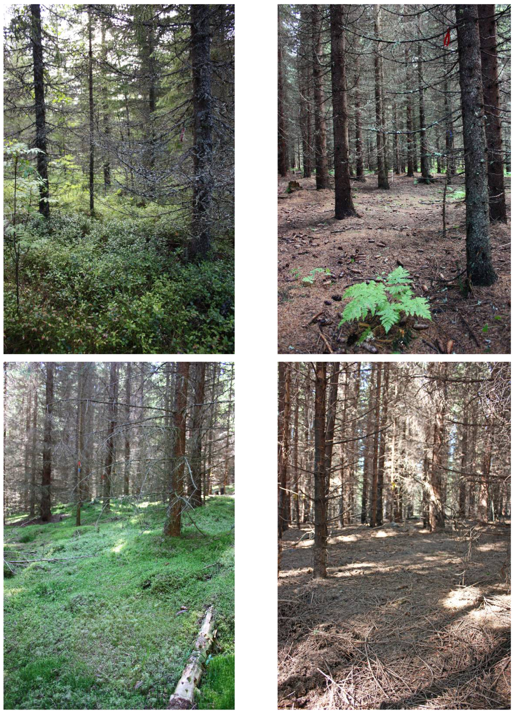 There are likely to be very few ground-living plants, epiphytic lichens or bryophytes in the intensively managed stands, due to the dense canopy and (hence) low light availability [25,26]. Thus, stand-level effects on these groups of organisms will probably be large. Furthermore, conventionally managed, unfertilized stands in southern Sweden have a sparse ground cover of vascular plants, while unfertilized stands in northern Sweden have richer and more developed ground vegetation. This suggests that the contrast between intensively managed stands and conventionally managed stands will be smaller, in absolute terms, in southern Sweden than in northern Sweden [25]. In north Sweden the plantations might even represent a new habitat type, not previously found in the landscape, so the effect may be larger than in the south in this respect. However, the difference in contrast will depend on the type of forest used as a reference. Since southern Sweden has a longer management history (including extensive planting of spruce), seen over a longer time-perspective, the effect of intensified management may be similar in both regions.