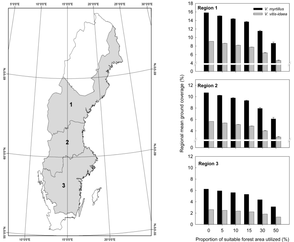 The effects of forest fertilization on vascular plants, lichens and bryophytes have been comparatively well studied, so the available literature was analyzed and summarized. However, no information was available regarding its effects on epiphytes (lichens and bryophytes), so estimates of these effects had to be based on expert judgments. There were also no data available for estimating effects at the landscape levels, so assessments at this level had to be done by scaling of effects from the stand level. We quantitatively analyzed the potential effects of intensive fertilization on the occurrence of two common and functionally important ground-living plant species—the dwarf-shrubs Vaccinium myrtillus L. and Vaccinium vitis-idaea L—in three regions: south Sweden, south-central Sweden and northern Sweden (Figure 2). We produced scenarios on how the regional mean ground coverage of these two species would be influenced, assuming that 5, 10, 15, 30, and 50% of forest land that regionally had been identified as suitable for intensive management was utilized. From the Swedish national Forest Inventory we got data on the overall current mean ground coverage of the two species in each of the three regions, and data on the mean ground coverage of the two species on forest land identified as suitable for intensive management. The effects on regional mean coverage were then estimated by linear extrapolation of stand-level cover values from intensively fertilized forest stands [25]. Empirical studies [25,26] suggest that V. myrtillus and V. vitis-idaea would be virtually absent from intensively fertilized stands in south Sweden (region 3 in Figure 2), so their cover at the stand level was set to 0% in our estimations. Based on data reported in [25], the cover of V. myrtillus and V. vitis-idaea in intensively fertilized stands in south-central (region 2) and northern Sweden (region 1) was set to 0.933% and 0.178%, respectively. In our analyses, these values replaced the current coverage values on 5, 10, 15, 30, and 50% of the forest land identified suitable for intensive forestry, and then the new overall regional mean coverage values were recalculated.