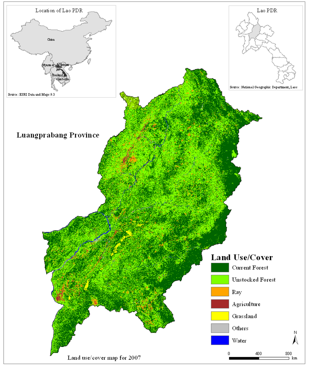 Luangprabang province is located in the northern part of Lao PDR (between 18°−21° N, 101°−104° E) (Figure 1). The province, covering an area of approximately 16,875 km2 is divided into 11 districts, namely Luangprabang, Xien Nguen, Nan, Park Ou, Nambak, Ngoi, Pakxeng, Phonxay, Chomphet, Viengkham and Phoukhoune [18]. The altitude of the study area varies approximately from 200 m to 2,257 m above sea level. According to the Lao Department of Statistics [18], the highest temperatures usually occur from March to October with a mean maximum temperature in the range of 30.9 °C to 33.5 °C. The study area receives about 2,104 mm of rainfall. Forest cover maps produced in 2002 by the Forest Inventory and Planning Division (FIPD) in Lao PDR show that Luangprabang province is dominated by unstocked forest covering approximately 60% of the province, while the upper mixed deciduous, ray and grassland occupy about 20%, 7% and 4% of the province, respectively. The “FAO Forest Resource Assessment” report [19] states that unstocked forest areas are previously forested areas in which the crown density has been reduced to less than 20% due to logging, shifting cultivation or other heavy disturbance; while ray is an area where the forest has been cut and burnt for the temporary cultivation of rice and other crops.