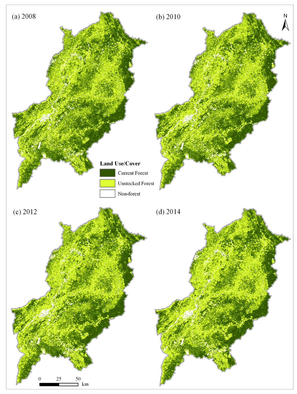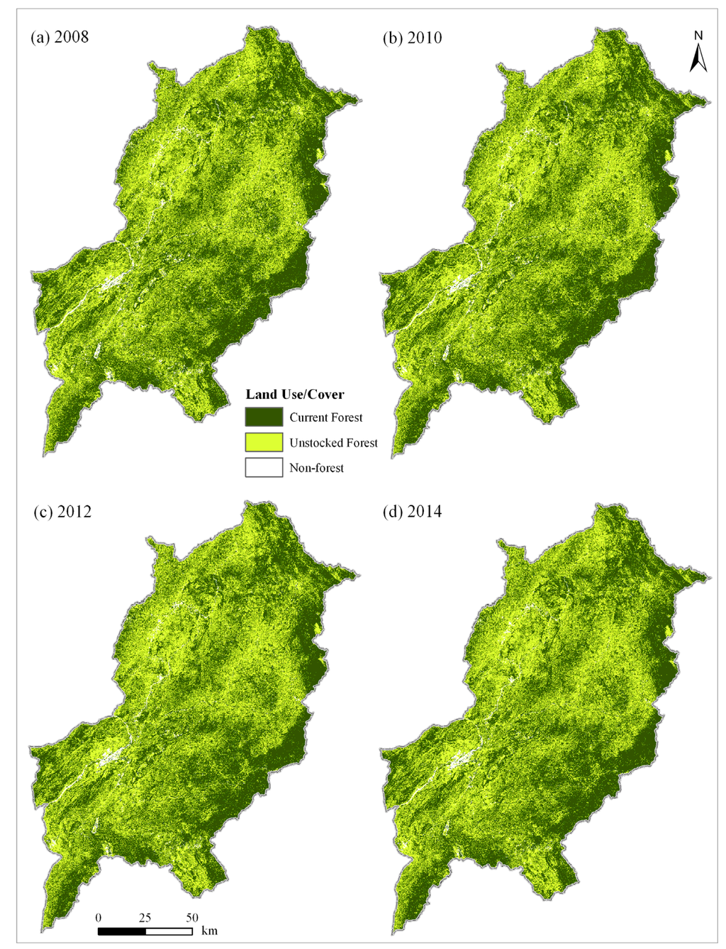 Results show that current forest and unstocked forest areas were dominant in the study area (Figure 2). From 1993 to 2000, unstocked forest areas increased substantially from 5,975 km2 to 8,003 km2, while current forest areas decreased from 12,803 km2 to 10,987 km2. Generally, non-forest areas decreased slightly from 1,172 km2 to 961 km2. However, from 2000 to 2007, unstocked forest areas increased from 8,003 km2 to 9,043 km2, whereas current forest areas decreased from 10,987 km2 to 9,727 km2. In contrast to the 1993–2000 period, non-forest areas increased slightly from 961 km2 to 1,181 km2 between 2000 and 2007.
