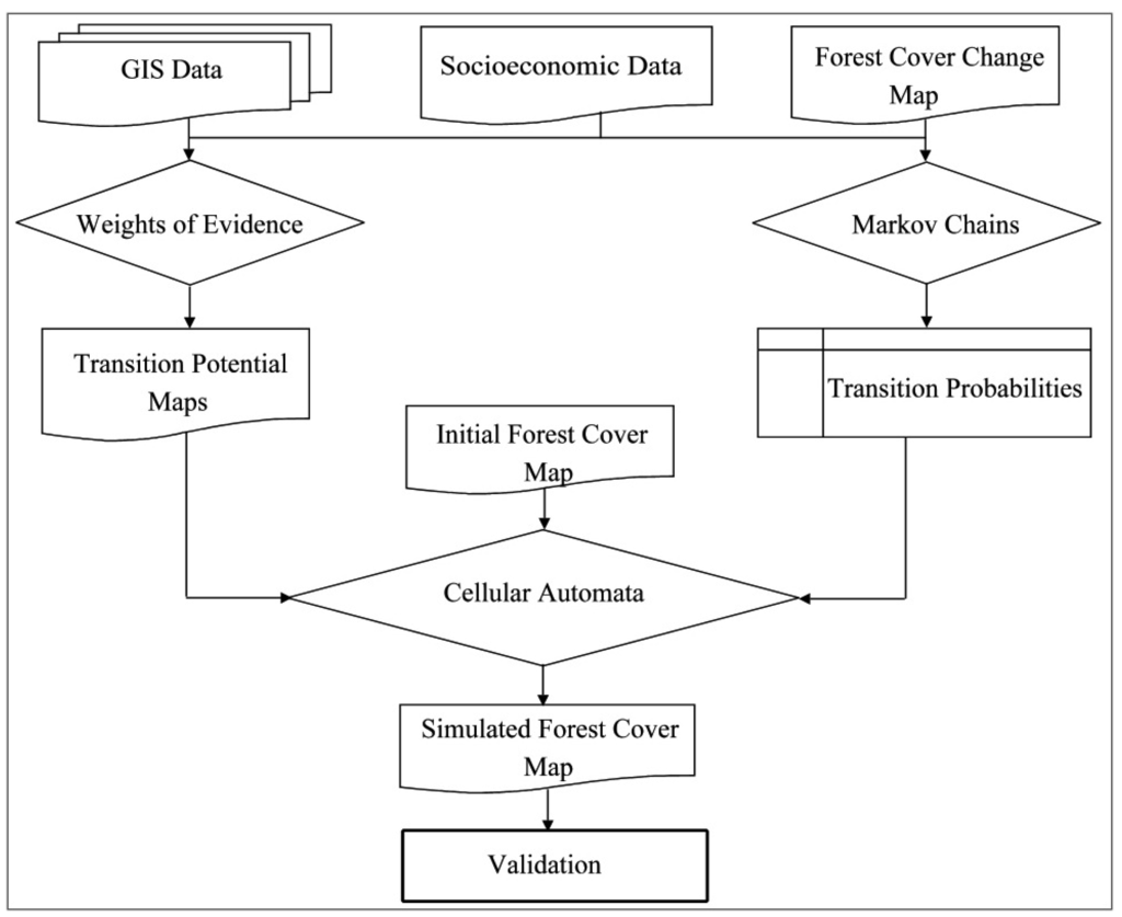 Although numerous spatial simulation models have provided valuable insights into forest cover change processes, particularly in the Amazon region [8,10,13,14], forest cover change dynamics are still poorly understood in South-east Asia, especially in areas under shifting cultivation systems [15,16]. This is mainly attributed to the fact that land use and forest cover changes exhibit high degrees of spatial and temporal complexity in tropical areas, which are influenced by various underlying driving factors [17]. In this regard, flexible spatial simulation models with the capacity to develop insights into forest cover change dynamics as well as explore “what if” scenarios (for forest cover changes) are required. The Markov-cellular automata (MCA) modelling approach can be used to gain insights into the current and future forest cover changes given its simplicity and flexibility. More importantly, the MCA model has the ability to model multidirectional land use and forest cover changes. For example, a landscape can change from either forest to non-forest or vice-versa. Furthermore, past studies have shown that the MCA models can be reliably used to simulate future land use and forest cover changes [10,13,15].