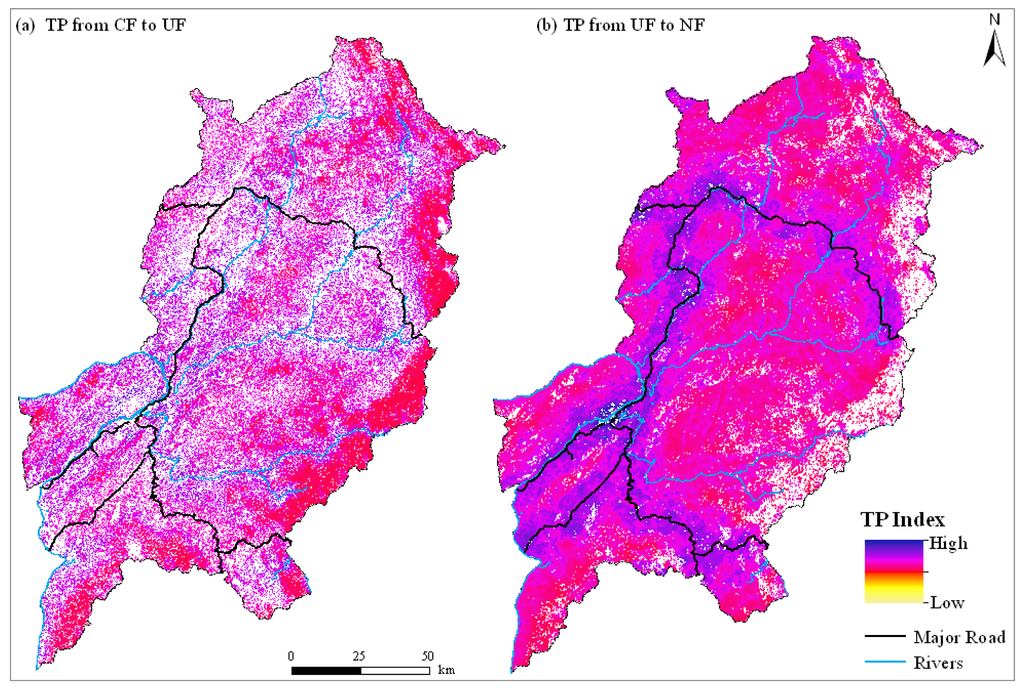 First, we used elevation, slope,“distance to major roads”, “distance to rivers”, “distance to town center”, “distance to deforested areas” and population density (Table 1) to compute transition potential maps based on the “weights of evidence” technique in Dinamica EGO [35-39]. In addition, the “weights of evidence” technique was used to quantify the influence of the driving factors (Table 1) on each type of forest cover transitions. In this study, “current forest to unstocked forest”, “current forest to non-forest”, “unstocked forest to current forest”, “unstocked forest to non-forest”, “non-forest to current forest”, and “non-forest to unstocked forest” transitions were considered for the computation of the transition potential maps. Since the basic assumption of the “weights of evidence” technique is that driving variables must be independent, we tested the correlation between the driving variables using the Crammer coefficient (V). Results indicated that elevation, “distance to major roads”, “distance to rivers”, “distance to town center”, “distance to deforested areas” and population density have values lower than the empirical threshold of 0.5 (V is less than 0.5) and thus are are not correlated [13,34]. Slope was not used in the final computation of the transition potential maps since it has a Crammer coefficient (V), which is more than 0.5 (Table 3).