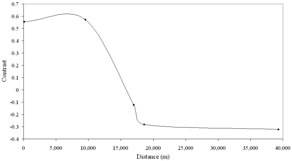 Spatial analysis of the “current forest to unstocked forest” and “unstocked forest to non-forest” transition potential maps revealed that high deforestation propensity is influenced by distance to major roads and rivers (Figure 4). This is consistent with the results from the “weights of evidence” analysis, which indicate that the decrease in current forest areas (that is, change from current forest to unstocked forest and non-forest) is largely influenced by distance to roads and rivers within 10,000 m buffer zones. Figure 5 shows contrast values, which indicate the relationship between “distance to major roads” and deforestation (that is, the change from current forest to unstocked forest). Contrast is the difference between the positive and negative weights (derived from the “weights of evidence” analysis) that is used to measure the correlation between a particular forest cover change and sampled training points for each variable [40]. Positive contrast values (above zero) indicate that areas within the 10,000 m distance ranges are more suscpetible to deforestation, while negative contrast values (below zero) show that areas over 10,000 m distance ranges are less susceptible to deforestation [35].