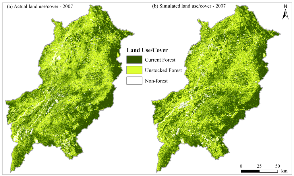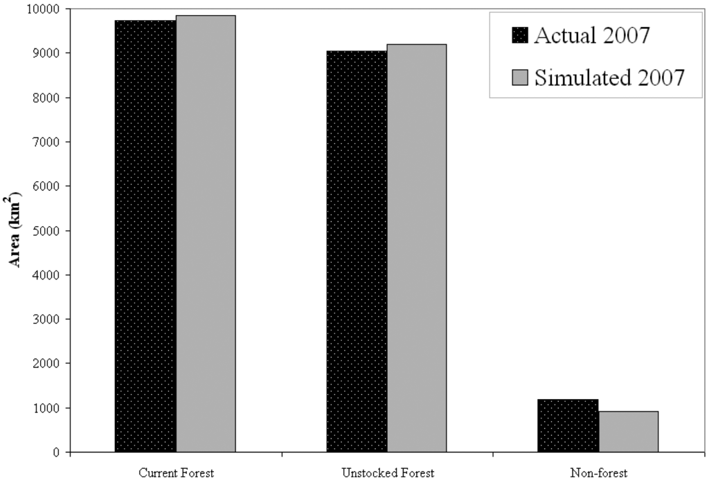 For model validation, we used the conventional Kappa statistic to compare the simulated forest cover maps for 2007 with the actual (observed) satellite-derived forest cover map for 2007 under the BAU scenario. Visual analysis of the simulated forest cover map in 2007 revealed that the MCA model simulated the current forest and unstocked forest areas relatively well (Figure 6). The best agreement is shown in the unstocked forest and current forest classes (Figure 7). For example, the actual unstocked forest class was 9,043 km2, while the corresponding simulated class was 9,194 km2. On the other hand, the current forest class was 9,727 km2, while the corresponding simulated class was 9,841 km2. The results indicate that forest cover classes such as current forest and unstocked forest areas, which occupies the highest proportion of area in the province have higher accuracy. This suggests that the model's simulation accuracy increases with the proportion of a given forest cover class. While the nonforest class was slightly underpredicted (the actual class was 1,180 km2 compared to the corresponding simulated class, which was 914 km2), the MCA's overall simulation accuracy was 0.8, which is relatively good for simulating future forest cover changes. The MCA model accuracy is within the range of accuracies observed in other studies that have used similar spatial simulation modelling approaches [41,43-45].
