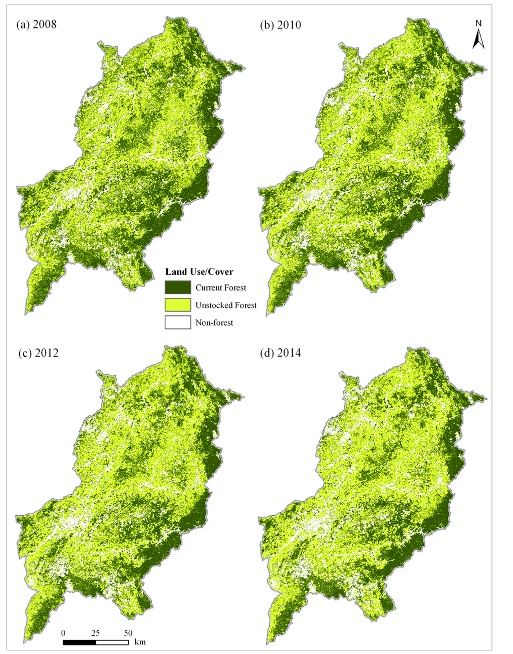 Under the optimistic scenario, the MCA model simulations projected an increase in current forest areas (from 9,727 km2 in 2007 to 11,112 km2 in 2014), while unstocked forest areas would also decrease moderately from 9,043 km2 to 8,542 km2 over the same period (Figure 10). However, non-forest areas would decrease significantly from 1,181 km2 in 2007 to 297 km2 in 2014 (Figure 10). The MCA forest cover change simulations revealed an increase in current forest areas in the future since the protected forest areas were used as a constraint to deforestation.