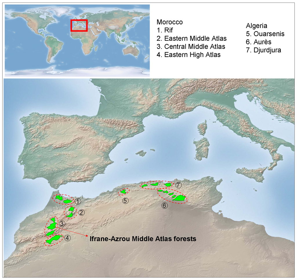 The genus Cedrus may have once been present in coastal mountains of the former Tethys Sea from north-western Africa and southern Europe to western Asia, including the rising Himalayas. The Pleistocene ice ages and emerging deserts isolated the western, central, and eastern populations, leading to speciation and caused the extinction of the genus in Europe. Currently, this genus includes three extant species native from the Mediterranean mountains and one species from the Himalaya: Cedrus atlantica Manetti, from Algeria and Morocco; Cedrus libani Rich., from Asia Minor; Cedrus brevifolia (Hooker fil.) Henry, from Cyprus; and Cedrus deodara Don, from Afghanistan and southern slopes of western Himalaya. The Atlas cedar forests (Figure 1) cover an area of over 130,000 ha [] distributed in Morocco (Rif, Middle Atlas, and north-eastern High Atlas) and Algeria (Aurès, Belezma, Hodna, Djbel Babor, Djurdjura, Blida and Ouarsenis). Atlas cedar occurs at elevations of 1,300 to 2,600 m a.s.l., where the amount of annual rainfall ranges from 500 to 2,000 mm and the minimum temperature of the coldest month ranges between −1 and −8 °C [,]. The Middle Atlas (northern Morocco) contains about 80% of the Atlas cedar forest surface area (ca. 100,000 ha). Middle Atlas cedar forests contain several evergreen (holm oak, Quercus rotundifolia Lam.; prickly juniper, Juniperus oxycedrus L.; European holly, Ilex aquifolium L.) and deciduous (Acer opalus Mill., Crataegus laciniata Ucria) tree and shrub species.