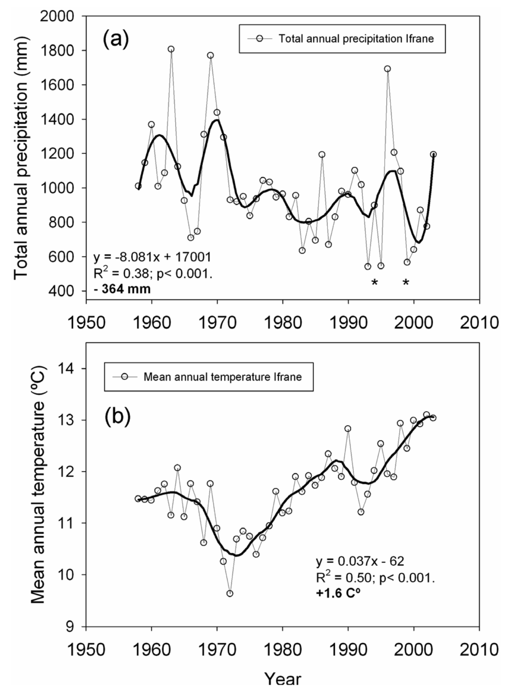 We used local climatic data (annual and monthly mean temperature and total precipitation) from the Ifrane meteorological station located 14 km from the studied plots (33°32′N, 5°07′W, 1,630 m, period 1958–2003) in order to quantify temperature and precipitation trends over the second half of the 20th century. We also used these data to identify extreme drought events, defined as years with total precipitation at least two standard deviations below the mean []. For the estimation of long-term trends, the raw climatic data were smoothed by polynomial regression and weights computed from the Gaussian density function (LOESS). Trends were then estimated over the smoothed series by least-squares linear regression, as well as the average slope per decade [,].