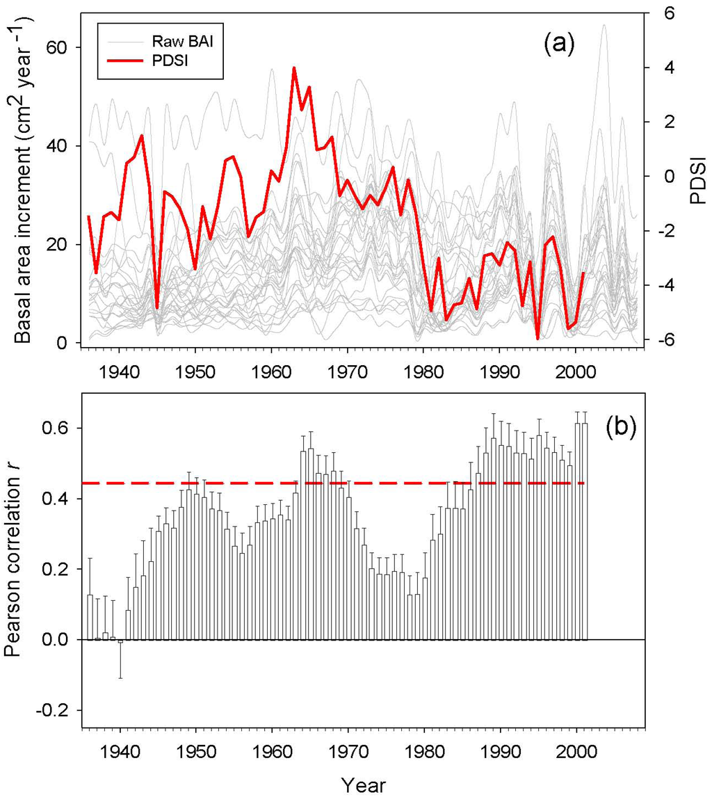 BAI trends were calculated for different time periods by least-squares linear regression []. Drought sensitivity was defined as the BAI variance explained by the Palmer Drought Severity Index (PDSI). We used the PDSI reconstructed by Esper et al. (2007) for the same study area []. We expected a high correlation between the PDSI and BAI data, since PDSI was reconstructed using as a proxy Atlas cedar tree-ring widths. However, Esper et al. (2007) focused on old growth cedar trees and used standardized chronologies [], while the present study sampled dominant and co-dominant trees and used raw BAI data. Based on this difference, it would be expected to obtain contrasting correlations. Therefore, we assumed that those periods when the correlations between PDSI and BAI are low may correspond to growth suppressions or releases induced by local non-climatic perturbations, such as human logging and pruning, and/or insect outbreaks. Correlations analyses were performed for the following time spans: the entire 20th century, the second half of the 20th century, the period 1970–2009, and the period 1990–2009.