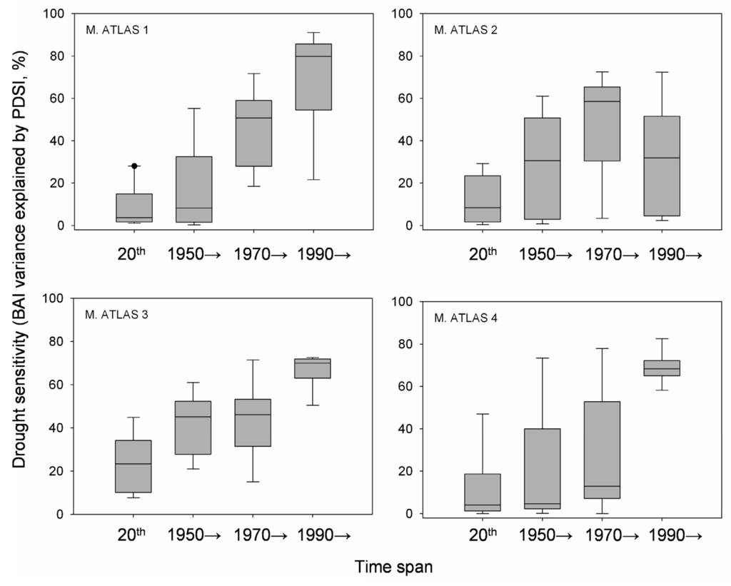 Our results support the contention that rising spring-to-summer temperatures and decreasing rainfall from winter to early summer will magnify Atlas cedar drought stress and growth decline [,-]. Dendroclimatic reconstructions of drought in North Africa confirm that during the early 2000s this area experienced the most severe droughts since at least the middle of the 15th century []. Such retrospective assessment based on tree-ring Atlas cedar chronologies is also consistent with climate data and model projections which respectively indicate and forecast a trend of increasing aridity in the Mediterranean Basin for the past and current centuries [-].