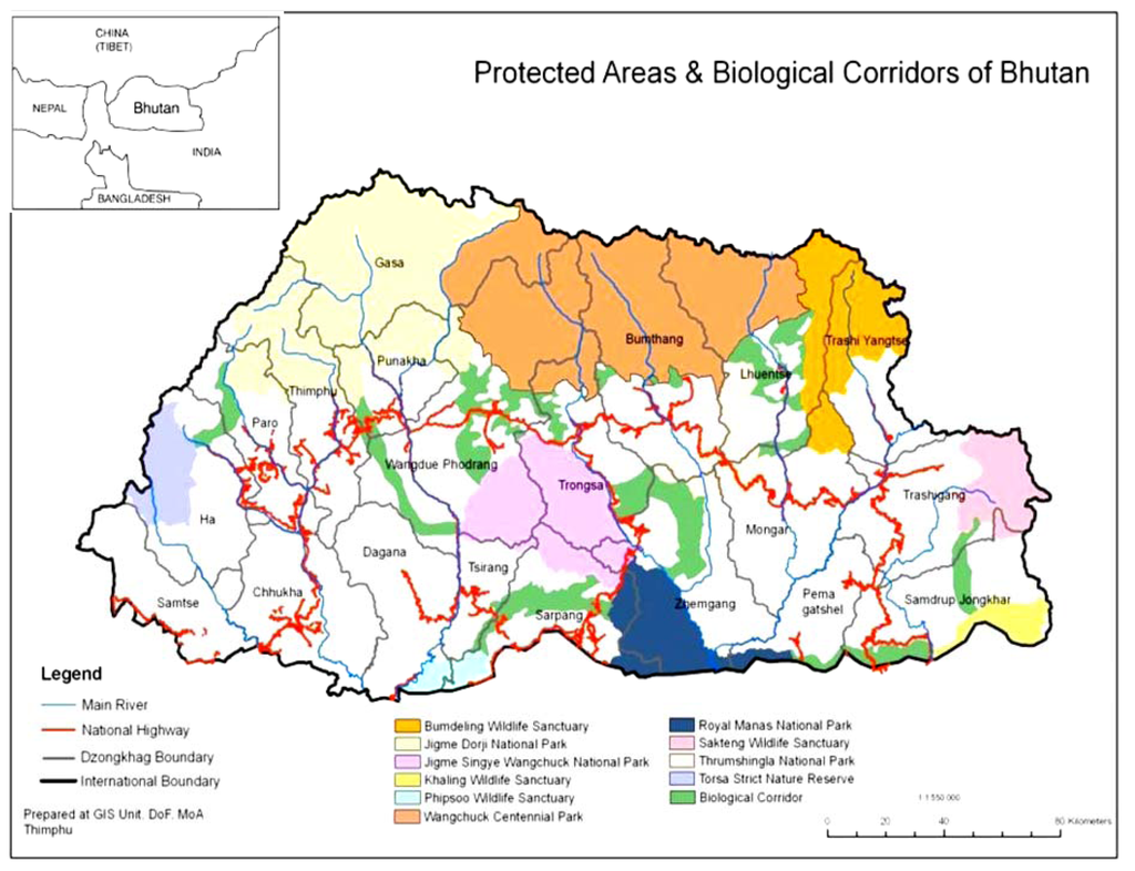 Protected areas in Bhutan (Figure 1), which occupy 51% of the total land area [1], do not charge entrance fees, partly because there are communities in the parks. In the case of Jigme Dorji National Park, which has a total area of 4,316 square km, a population of 6,000 people lives mainly in Gasa district or the vicinity [2]. Unlike many national parks in developed countries, Gasa residents live in a roadless area.