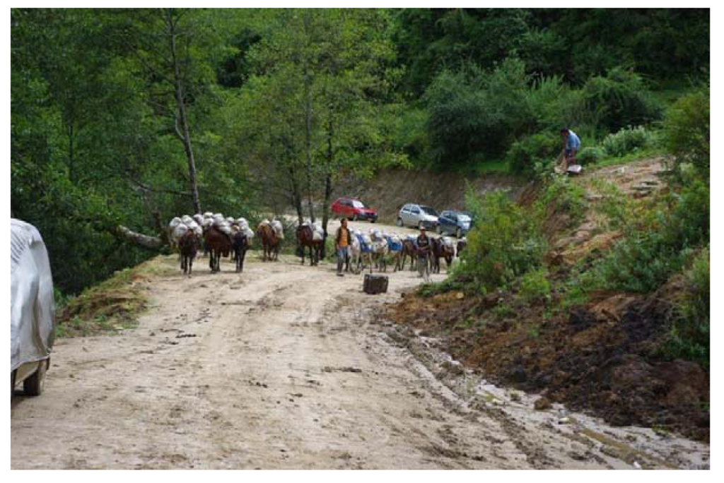 The south–north highways were often constructed over existing trails. The mountainous parts of the east–west highway did not replace old trails. As Matsuo observed in 1969, road construction was disconnected from trails, with intersections occurring at diverse intervals. Such left-over trails are still used by nearby residents to collect fuel wood and for other subsistence activities but are no longer used by mule-packing traders or trekkers (Figure 5). They are not designated as official trails and are not shown on tourist maps.
