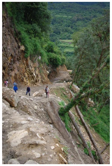The third trek, the Laya–Gasa Trek, has changed since it was walked by Nakao. Japanese TV crew also walked from Punakha to Gasa in 1993. However, following road construction, the trailhead has shifted toward Gasa every year. The first edition of Lonely Planet Bhutan [18] mentioned that the road from Punakha ended at a forestry office at Tashithang, where the district boundary is located. The fourth edition [26] mentioned that the trailhead was Damji, where the headquarters of Jigme Dorji National Park is located, but suggested that the road reached the suspension bridge beyond the Gayza community (Figure 11). However, the author observed that road construction beyond Damji would cause land slide problems (Figure 12). Indeed, severe rain fall in August 2010 cut off the road in several places. The district administrator of Gasa, Dasho Sonam Jigme, said, “Maintain the old mule track, so that people bypass the major roadblock,” to restore the old trail as a temporary lifeline [28] because an alternative route would require a 1-week walk to the east–west highway. His proposal suggested that the old trail not be taken over by the road and that it was more sustainable. This is because yak herders and horsemen prefer to use trails if they are not directly replaced by paved roads.