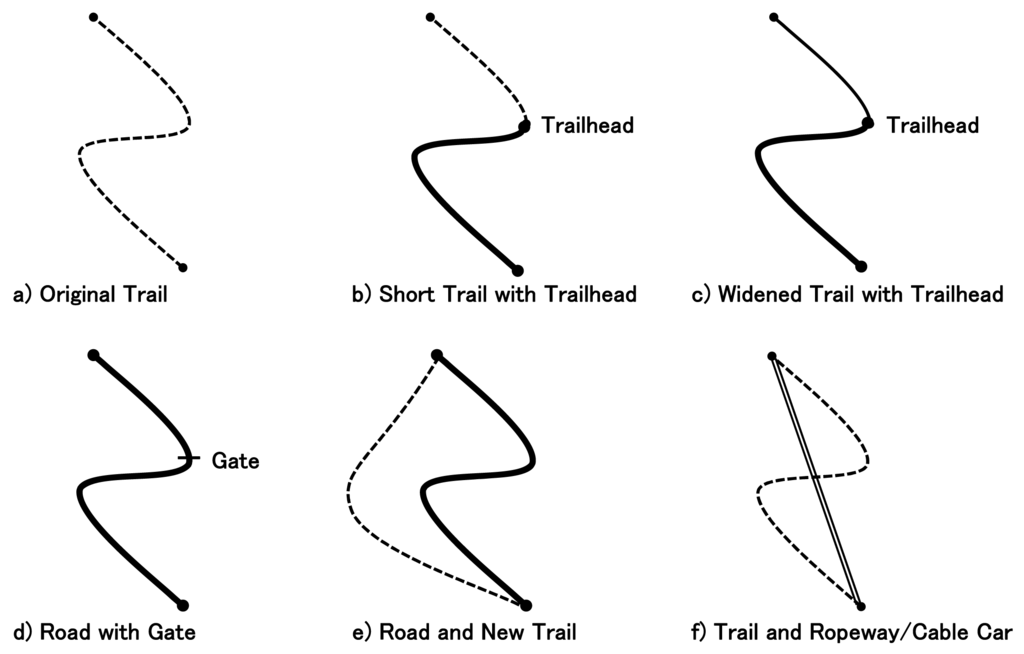 Benton MacKaye, a forester and regional planner in the Eastern United States, proposed using trails as a tool to control such mechanical civilization [32]. He proposed controlling metropolitan flow with dams and levees just like water control for flooding [33]. The dams are interpreted as filters for traffic control such as trailheads or gates, while the levees can be zones consisting of steep slopes or green belts to confine road influences. It is important to mention that MacKaye's idea developed from concerns about the rapid expansion of roads and automobiles in the United States after World War I. The situation resembles to that of Bhutan after 1962. MacKaye's dams and levees suggest the following two approaches with six options to control urban flow in protected areas of Bhutan (Figure 14). These approaches need to be employed together according to circumstances.