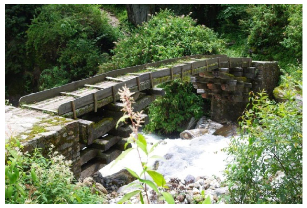 Third, if they prefer some improvement, a middle-path approaches taken by stock farmers in Alpine areas of Bavaria, Germany seems applicable to Bhutan. Ichida-Iwata [34] reports the consensus building process of roadless Almwirtshaft, or summer livestock farming in Alpine (Alm) zone of Bavaria. The local government supports Almwirtshaft not only based on ecological or on economic reasons, but also for cultural landscape and traditional environmental knowledge protection. The subsidy is used to maintenance of Alm huts, which are used both farmers and hikers, and transportation of such materials as faming tools by helicopter. Some Alms are located in roadless areas, and farmers take their livestock on foot and carry heavy equipments by helicopter. When the Alm farmers association appealed for the road construction or trail improvement, which hikers always stand against, the local government set the maximum width of 2.5 meters allowing only special vehicles like small tractors (Figure 14(c)). Such a moderate improvement of trails also sustains distinct cultural landscapes consisting of choltens and cantilever bridges (Figure 15) in Bhutan though the helicopter support will be limited by its cost and risk caused by topography or weather conditions.