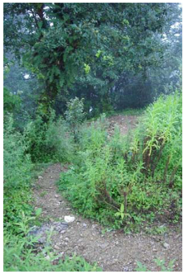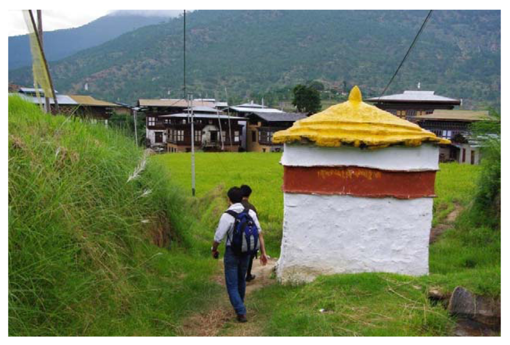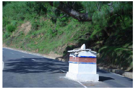The author visited Jigme Dorji National Park four times in the monsoon season. On his way to the park and back, he examined trail-to-road transitions and trailheads and made the following observations. On flat or gently-sloped lands, roads have replaced old trails without the addition of sidewalks. A cholten or stupa left over at the center (Figure 3) suggests that this used to be a typical trail (Figure 4).