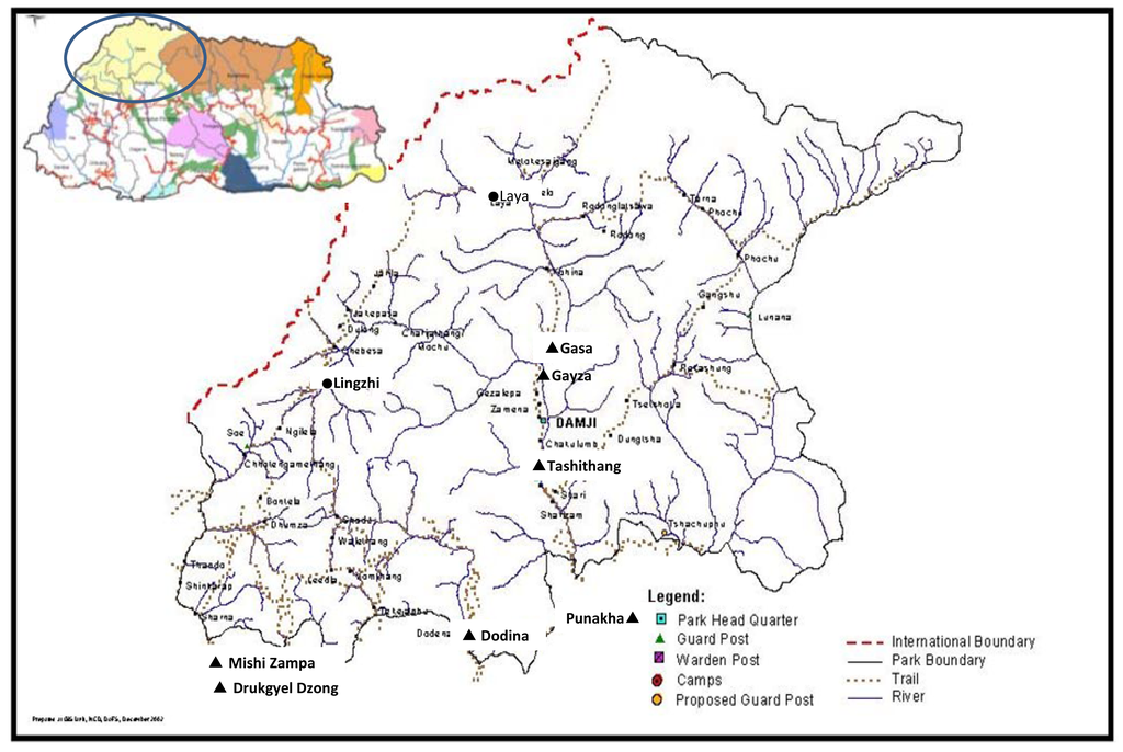 - Integrated Conservation Management Plan; Jigme Dorji National Park 2009–2012 Draft; Tshering, K., Ed.; Jigme Dorji National Park: Damji, Bhutan, 2009.