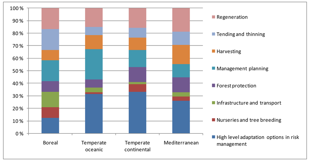 When all measures are taken into account regardless of their status, adaptation measures dealing with high level adaptation options in risk management are the most common in all regions except the Boreal region, where a lot of regeneration, tending, thinning and management planning measures are reported (Figure 1). A closer look at the status of the measures reveals that in all regions forests are already managed to be more tolerant to future conditions and extreme events; i.e., species and provenances that are more tolerant to future conditions are used in regeneration, and tree species diversity is taken into account in both the regeneration and thinning and tending phase to enhance the adaptive capacity of forests. In Mediterranean region investments in fire prevention policies (e.g., increasing private and public awareness, education campaigns of forest managers) and improving infrastructure for fire detection, control and suppression have been initiated. However, there are also many country-specific measures which are still in the planning phase—e.g., although there is a growing theoretical awareness about reducing the biotic and abiotic damage, there is still a high developmental need for monitoring and early warning systems. The future challenge especially lies in a cross-border implementation of such systems and the coordinated operation of adequate instruments at the EU-level.