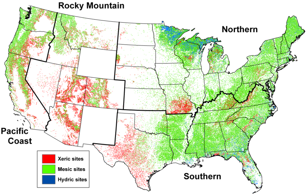 Mesic is by far the most common soil water classification, or physiographic class, identified at FIA inventory plots (Figure 1). The symbols on the map represent the physiographic class associated with each forest inventory plot from the most recent survey data per state. Note that the symbols are not proportional to forest area, and are not included for New Mexico and Wyoming because the most recent data for those states do not include physiographic class. Xeric stands are much less frequent, but distributed throughout the four regions. Hydric sites are much more common in the East, and they are present in the West but infrequent. In the East they are more common in the Northern Lake States and along the coastal plains in the South.